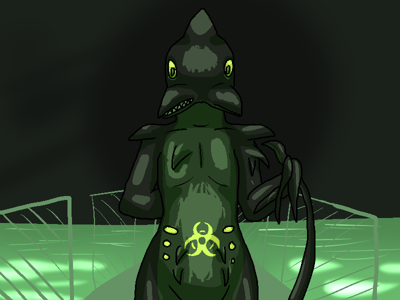 I hide next to the door and open it from a distance. She walks in, looks around in confusion and I take my opportunity. I leap at her, grab her, and smack her head into the wall. While she's dazed, I grab her tail and pull it as hard as I can. It writhes and comes off in my hand, darting frantically in the air. I wasn't expecting that to happen. I panic and throw it to the other corner of this spacious shower room.