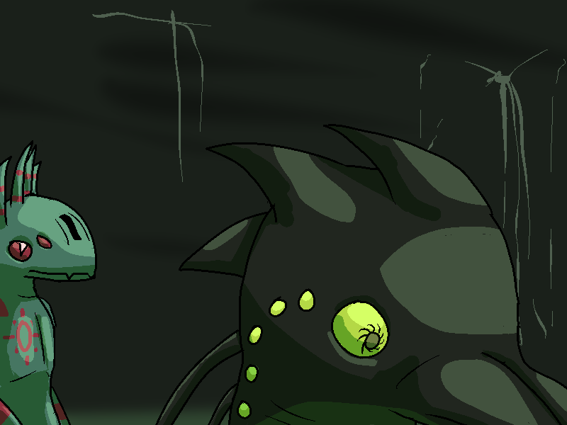 Roc unfurls his dorsal tentacle things. I jump on his back, and SB-40423 hesitates. I motion over for him to come join me.
