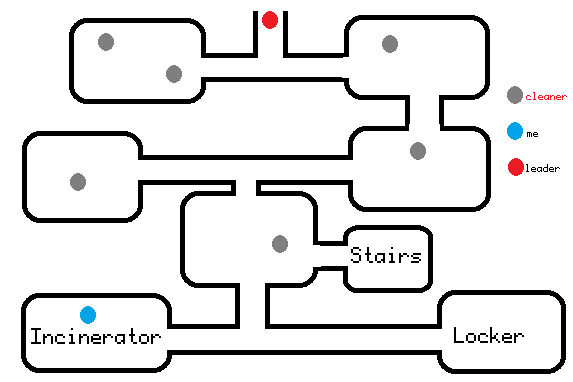 After convincing the other clean to assist in going to the incinerator I thoroughly question him about where the others are. He shares his map of this floor with me via download. He is lacking the necessary information about who has which of my items. The number of cleaners are 12 and the building we are in on the planet has 2 floors.