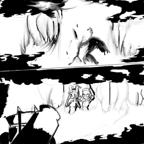 Acording to Sivex's appraisal the creature it is about 1 Johan and and a half of tallness,its sitting in a big slab of concrete,there's no stairs in view.(It's unknown if it carries a flaming sword,crown or potato sack or if it has wings.there's no proof that it doesn't have them though) The other group is not here .Sivex group haven't yet found any staircase to settle a safe place to guide them. Sivex's group can still try to guide them to their current location or try to bypass the creature.... Imput orders...