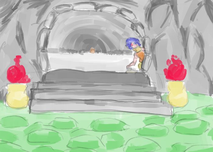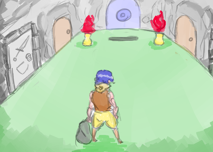 Hmmmm....looks t'be five doors 'ere. This one on th' left's got some markin' on it. These other three look t'be reg'lar doors, I dunno where they'd go. An' then there's this sorta blue one...I amember, Mum tol' me 'bout stuff like it. Made outta admatimine, I think! Mum sed th' dorves use admatimine fer guardin' important things, maybe th' babbies're in there? Which o' these doors'd you check first, m'lord?
