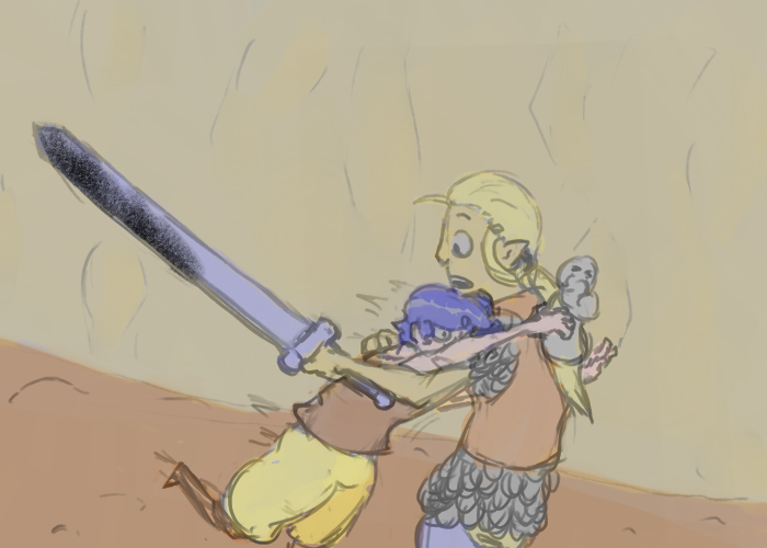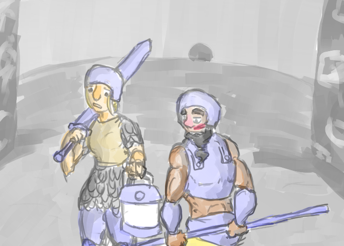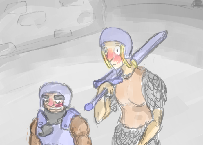 >"Ach, no difference now. We gotta go, the fort's gettin' ruined. I gotta head back to the trap tunnels an' see if Olin's okay, try rallyin' the guard.... Ye wanna stick with me? 'Dead dorves go best in pairs,' my pa always said..."