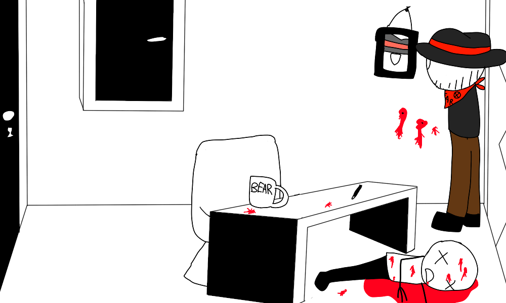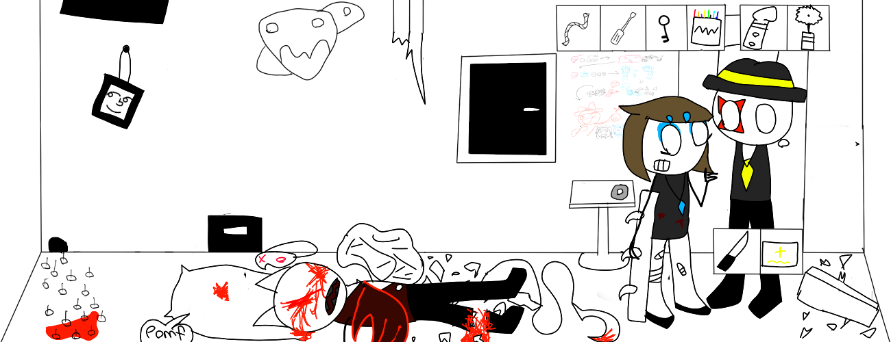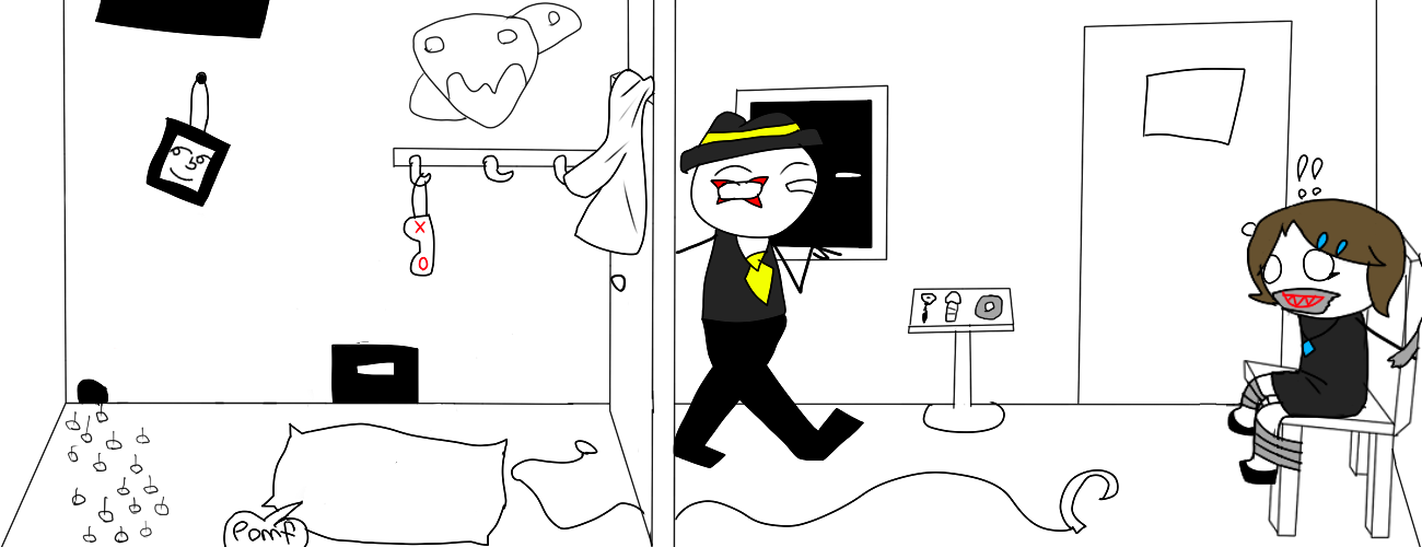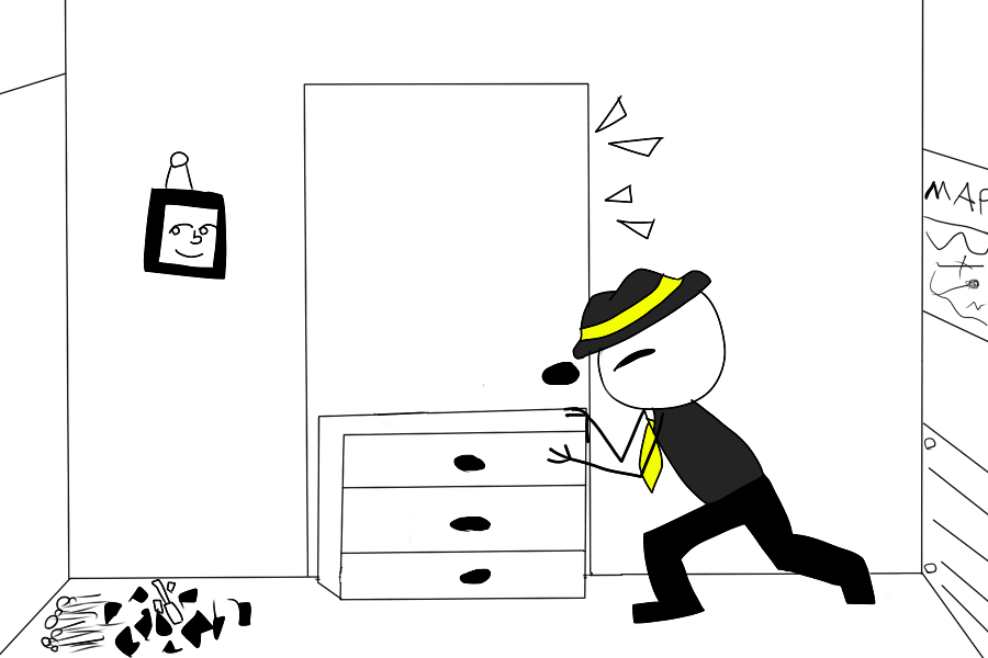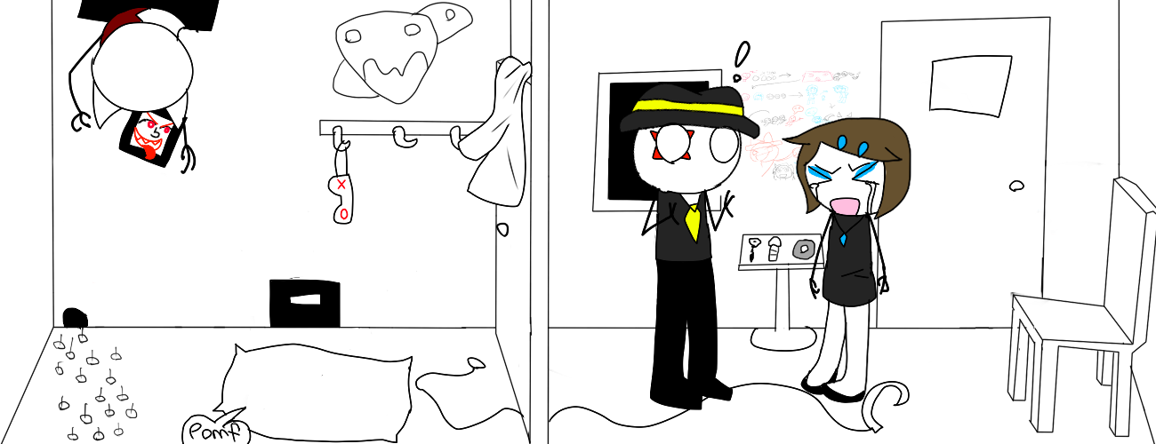 You wave your arms around to try bending and creating words out of thin air Disney style! However, it turns out you just had your detective hat down too low. You pull it up and now you can see your surroundings. You appear to be in a world where only Character Models are colored and the rest appears to be in black and white... Around you you can see two doors, a vent, a map, and a drawer. What do you do?