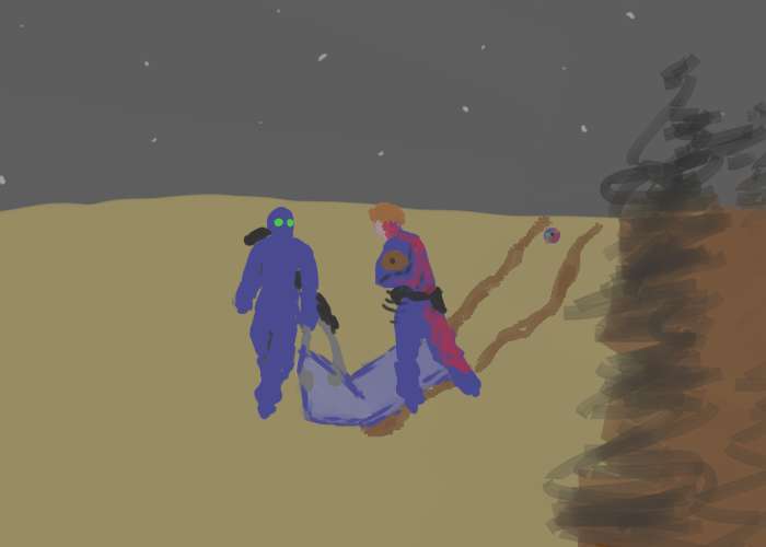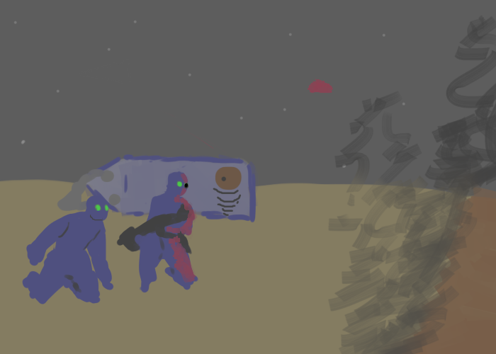 "We've gotten outta shit like this before, all we need's some good replacement gear and your torch. Looks like a few ships fell near us, some friendlies and some bugs. That big one's a bit of a march away but it's probably got the most and best stuff in it. We know from that business last week that bug stuff fits fine with our own hardware, so any of these should be good targets...which one should we go after, you think?"