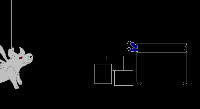 There's a large white pig demon thing around the corner. Hide in the dumpster. Or behind the boxes if you really can't stand that idea.