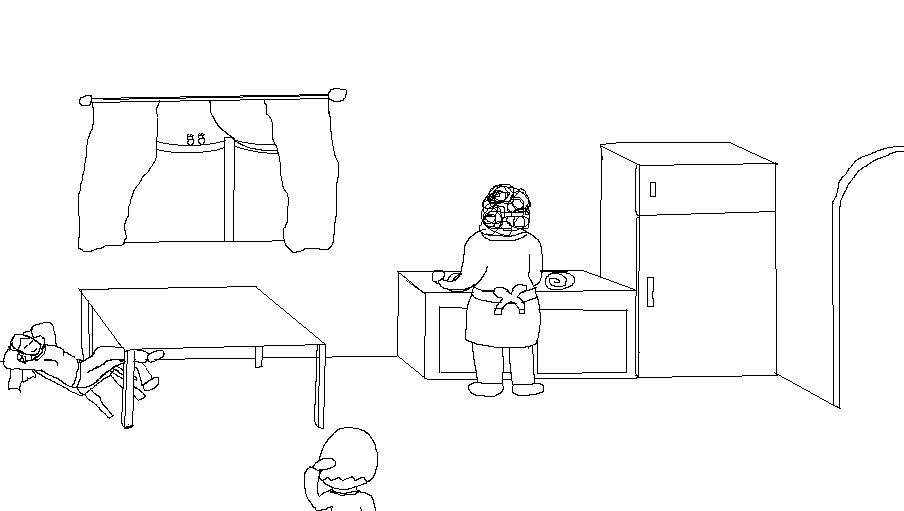 Grandma: "Oh your awake dearie, go sit down with little Alice over at the table. Jack will be here in a moment, he's busy dealing with some wee issues outside."