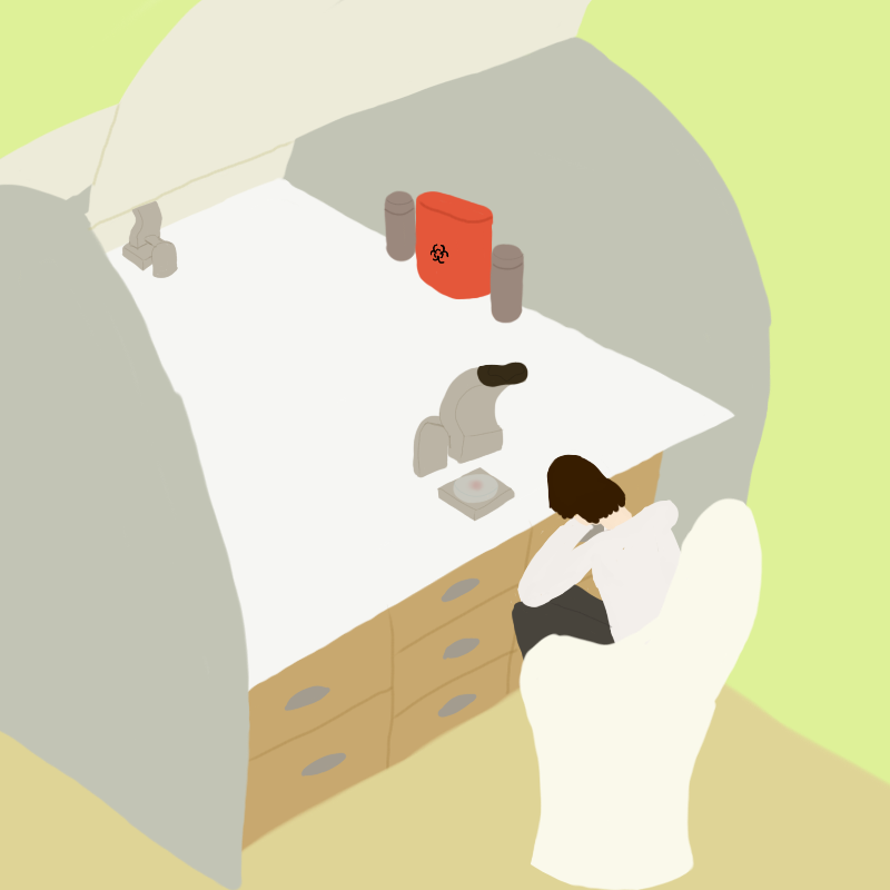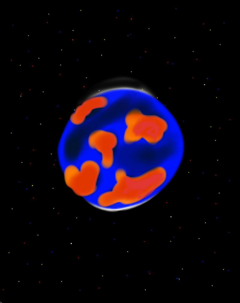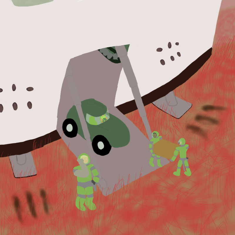 I guess it's good they're mostly ignoring that... um it's a model? Oh yeah, that one, that's the probe. what do you mean, a vision...? Um yeah, the probe. You know, the Von Neumann probes that flew out and started this whole thing with the - what are they called? gebrawns? Yeah, one of those probes. Except, you know, the real ones are a lot bigger obviously. Yeah going on this mission reminded me I should repaint it since they found out the original colors - huh how did they find that out anyway? It was unknown for like millenia and then fifteen years ago they just know? Weird, well anyway I'm in the middle of repainting it yeah so right now it's just got like half the base coat, but otherwise, well I mean on the body obviously the solar panels were already the right color, but uh, yeah that's what the probe looks like.