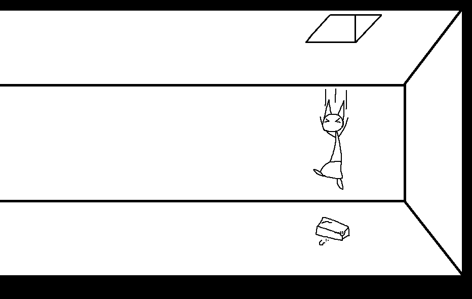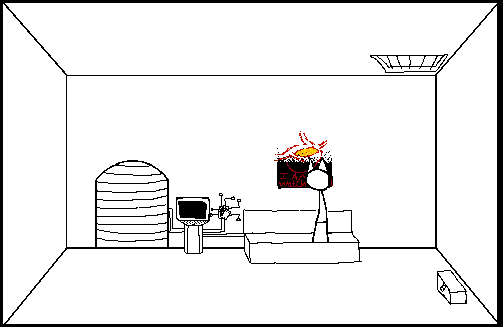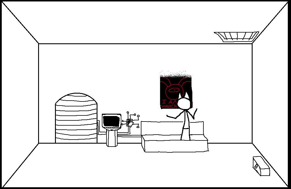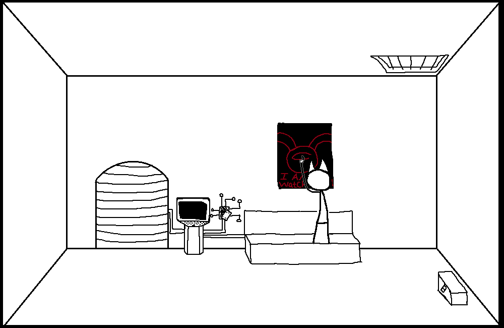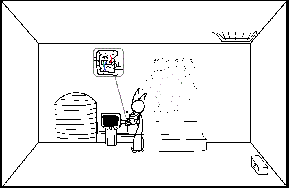 Use your tongue to reconnect the green wire, or draw some constellations in the black marks you left all over the wall, or change perspective so we can see the fourth wall. One of those should do.