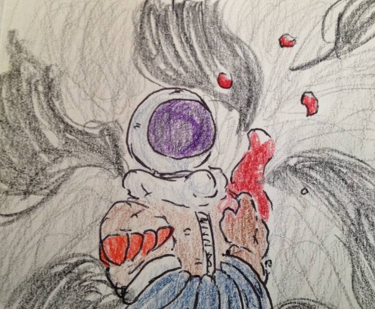 A shock of pain in your shoulder wakes you up. It takes a disoriented moment to realize that you're in the airlock of the survey station. You must have blacked out for a moment, you realize. How much blood have you lost? You feel lightheaded....