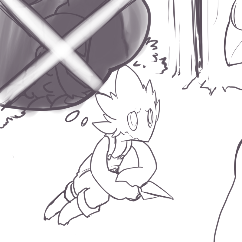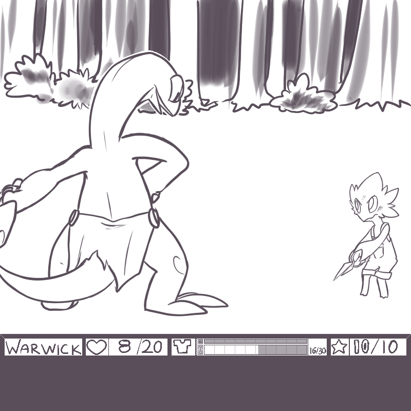 It isn't long before he sees a large shape moving through the thick trees, and a short further pursuit reveals it to be a large lizard with someone slung over their shoulder! Warwick attempts to creep closer, but the figure suddenly stops and turns! Apparently Warwick isn't very good at sneaking!