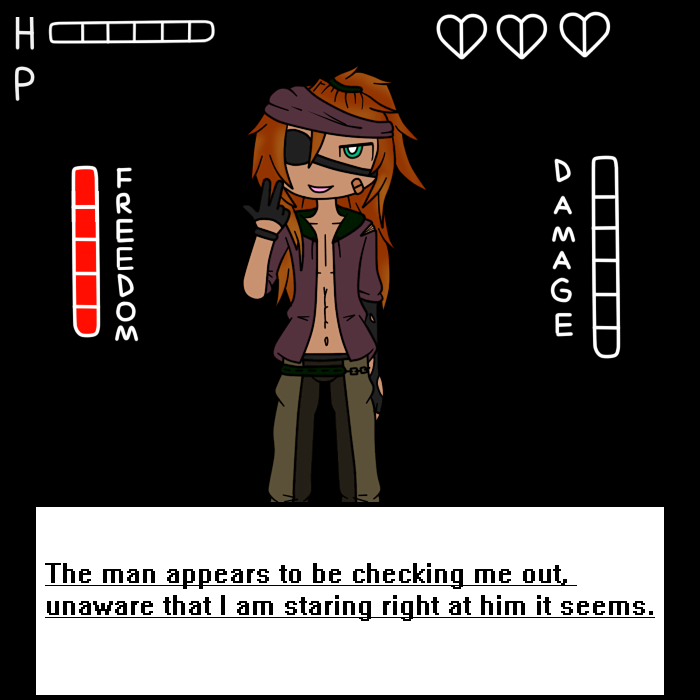 TOXIC: "Hmhmhm. A good question indeed. As mentioned before I am the leader of a gang. We had a pretty big goal to take a princess hostage and demand the Duke money for her back, however, as it turns out, she was pretty crafty herself. She used a shard off the ground to cut her bindings and successfully rid me of one eye. Unfortunately she got away, as I was pretty much blinded by blood."
