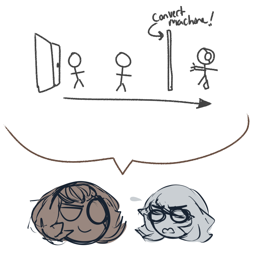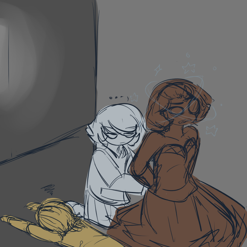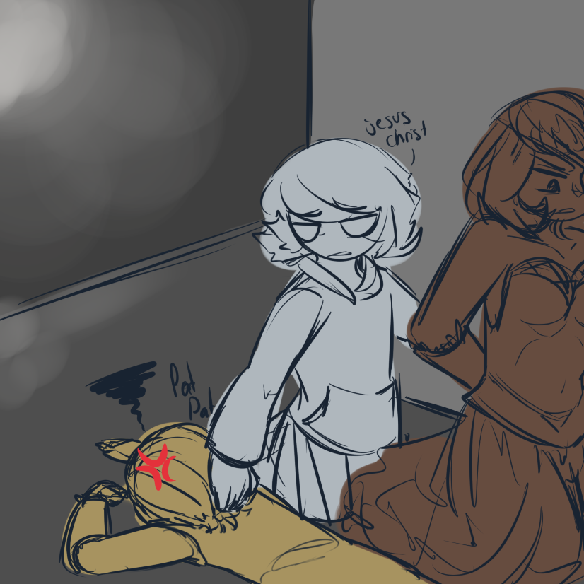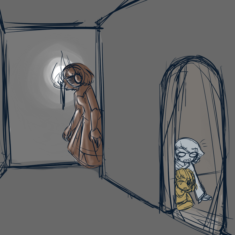 Whispering, you mention that Janice is coming down the hall, and they sigh. Briefly, between wheezes and and the such, that they're not sure how to handle this. They'd suggest running, but without them, since they're really only dead weight. There's also a good chance in a fight, since at this point she'd underestimate you. With that advantage, you could incapacitate her and buy time for both of you, but once again you're going against a clock monster.