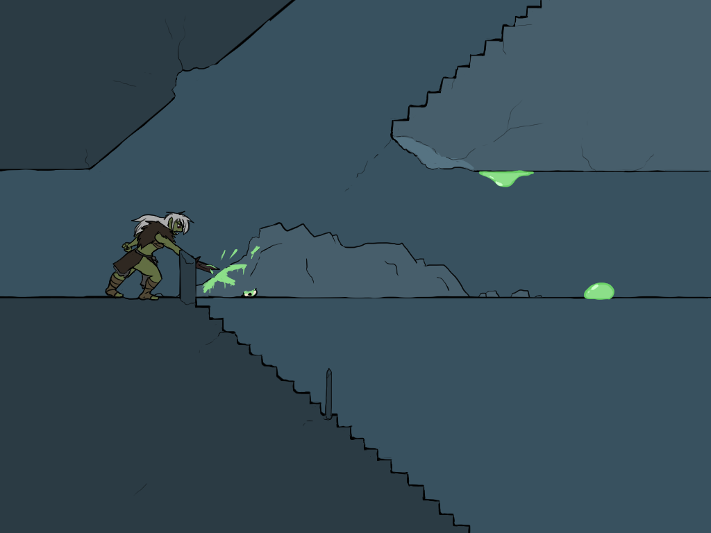 Throw worthless non-trophy skull at ceiling slime to assess hostility. If it's harmless, or thereby distracted, jump up onto the broken stairs, because the best loot is probably in the hardest-to-reach places.