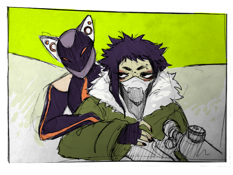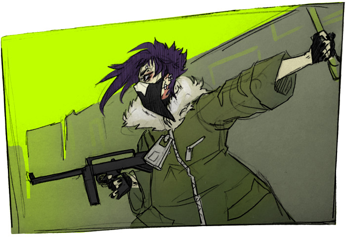 You click off your logmic and glare at your partner and his shitty fucking cat helmet. "Voltolini. Two things. One: Call me by my last name when we're on a foray. Two: Shut the fuck up while I'm logging. Actually, just shut up in general."