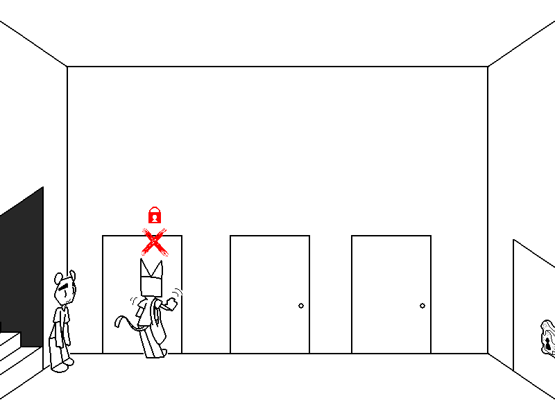 I position myself in front of the first door and twist the knob. Nothing. Seems to be locked... I can tell where this is going...