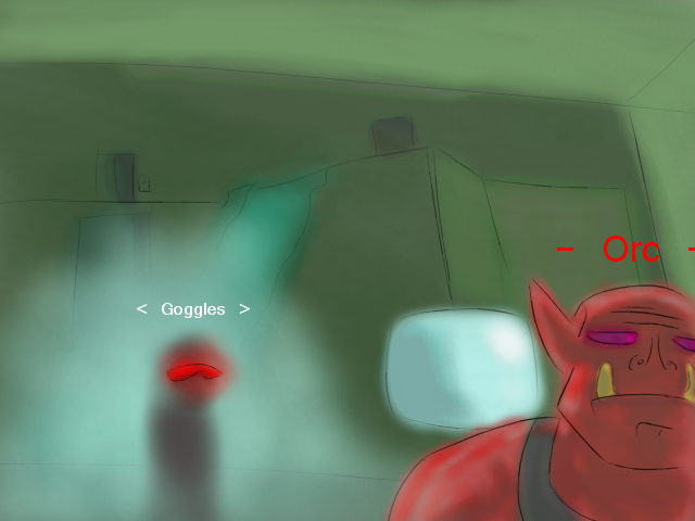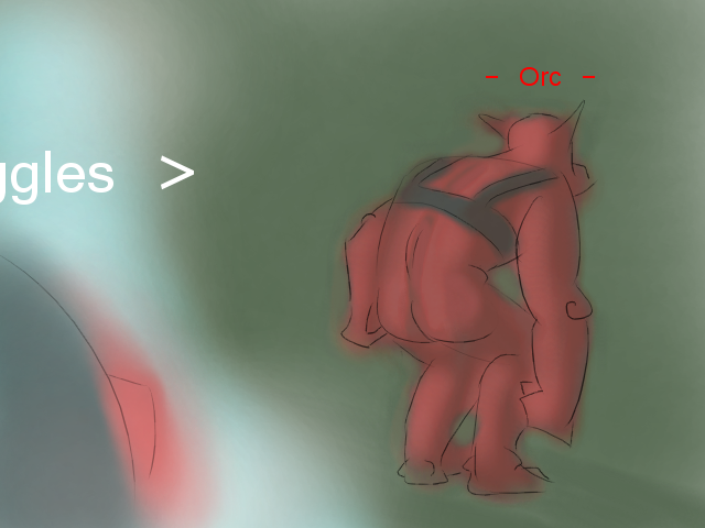 This dungeon should probably have stuff my level. I'm on a ledge. It's hard to see what's below because of that weird luminescent waterfall's mist could, but there's definitely an orc down there. Looks like a video screen of some kind, too. I could probably slide down the waterfall, or take that lift just after it. There's also a box up here.
