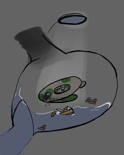 Finally, your voice reaches its crescendo. You hold your arm above the altar, and, with an overly-dramatic gesture, you cut into your wrist. The pain is lost in the adrenalin of the moment, but you gasp out a cry anyway. Warm blood surges forth, rolling down your arm and dripping down into the waiting cup below. Blood falls among the stars.