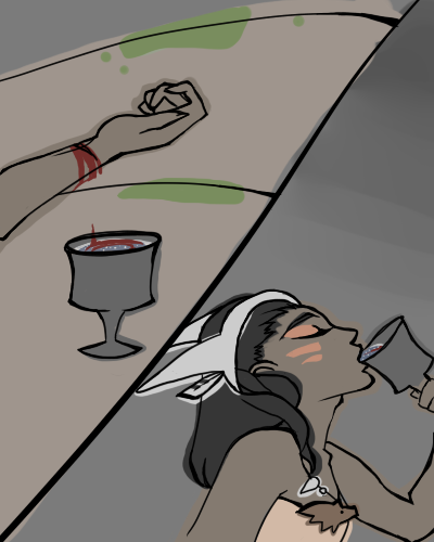 Slowly, you take the cup in your hand. It's surprisingly heavy, as though it does indeed contain the whole weight of the night sky. It savors the moment as you bring it to your lips. You inhale deeply the smell of blood and brine, then gulp down the contents of the cup.