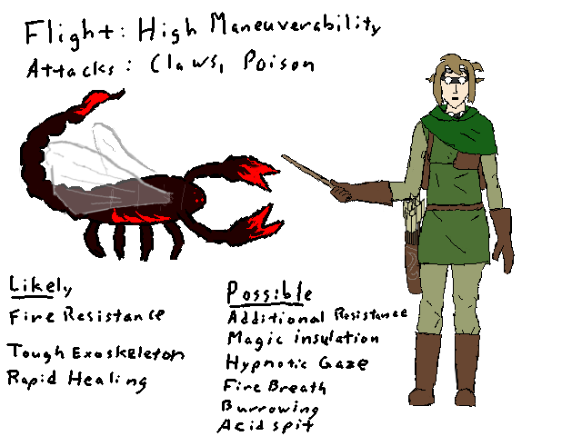 "Regardless, we should be aware of a few things. The claws and sting are the obvious threats, but there is more we can conclude. Flying bugs are not necessarily fast, but they are often able to turn suddenly and even come to a full stop in mid-air which will make outflanking them difficult. In addition, creatures so influenced are often resistant to both flame-"