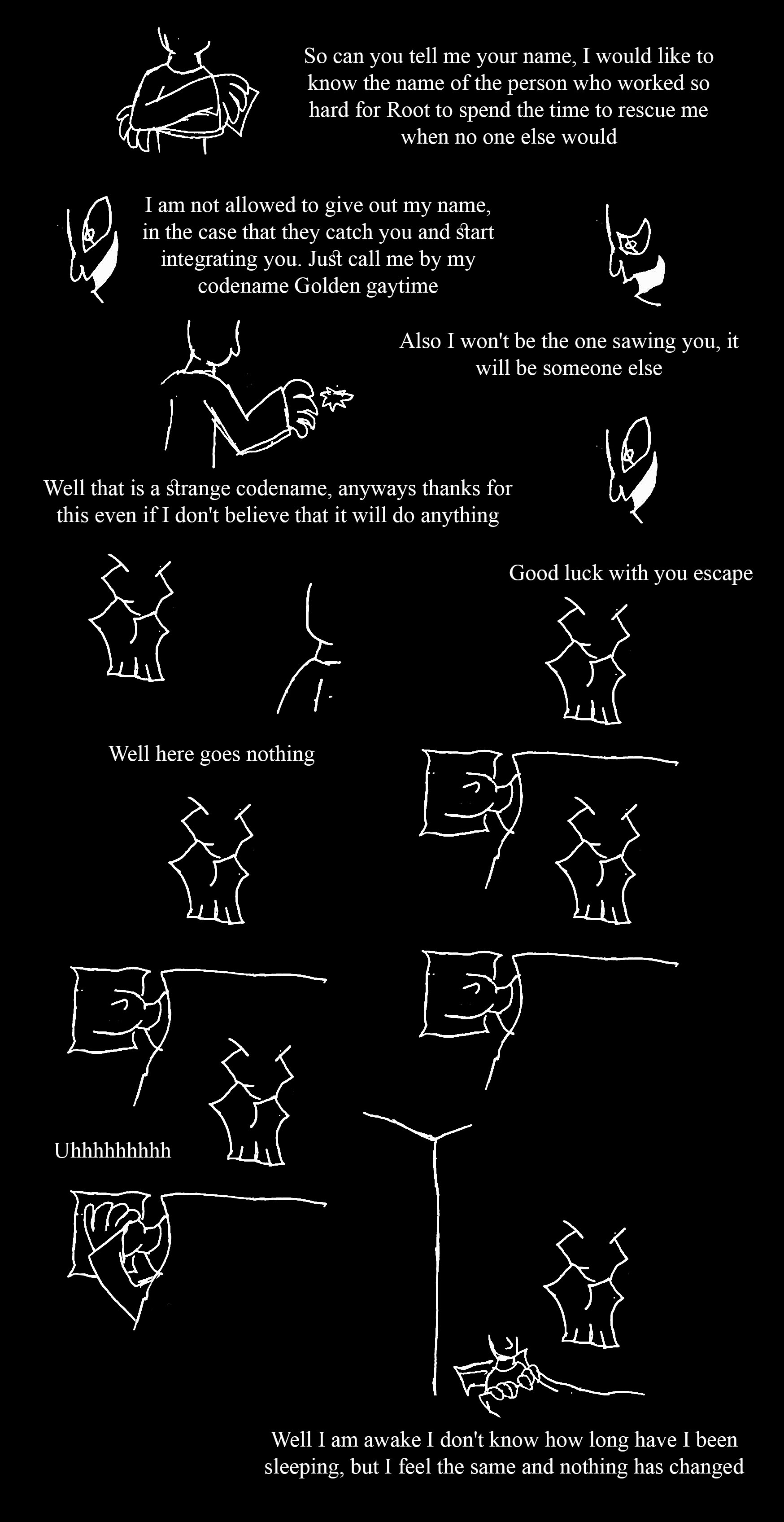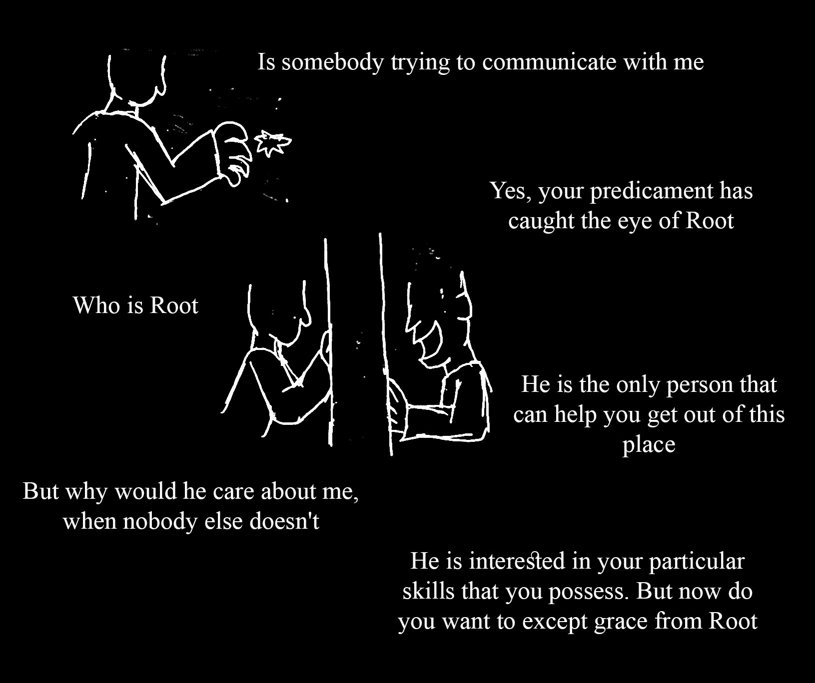 Hm, Root is probably mistaken and thinks that you killed all those people, even though you didn't. But you might as well play along, any way to get out of this place.
