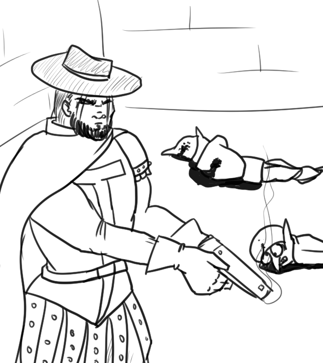 A man wearing a wide brimmed hat and some sort of metallic, bird-like mask greets you. He is wrapped in a wide, shiny cloak.