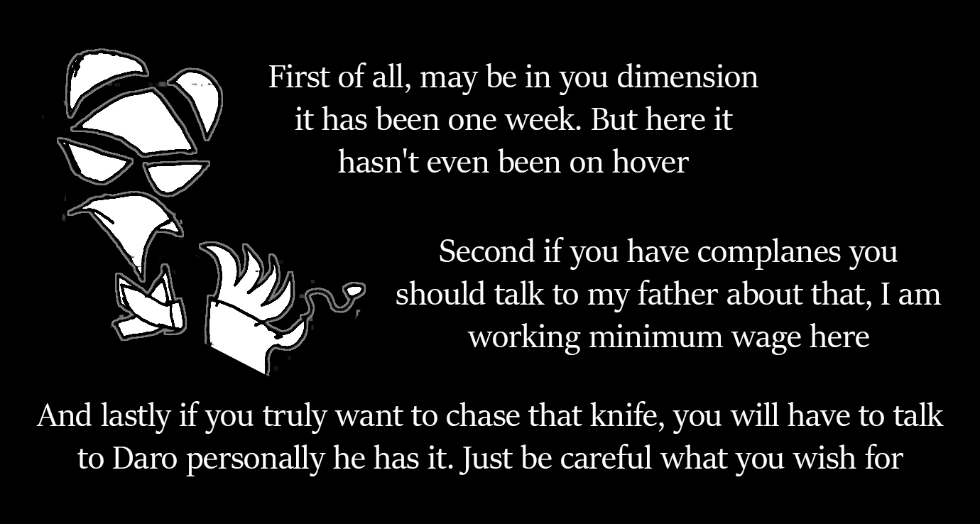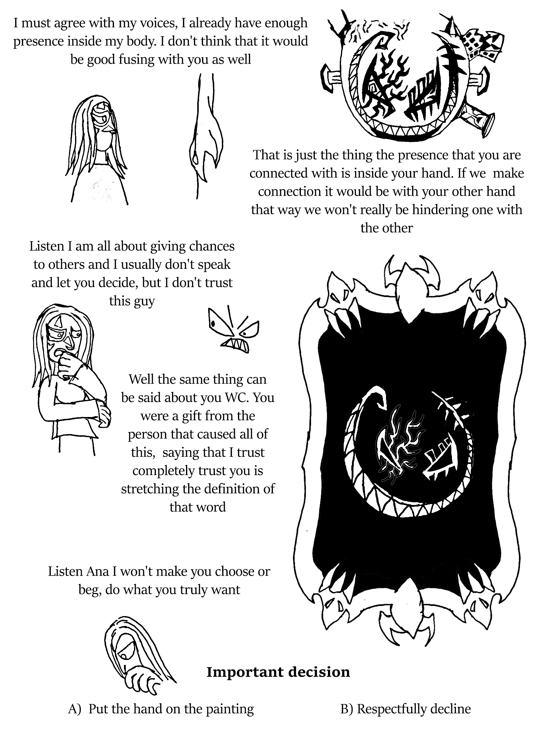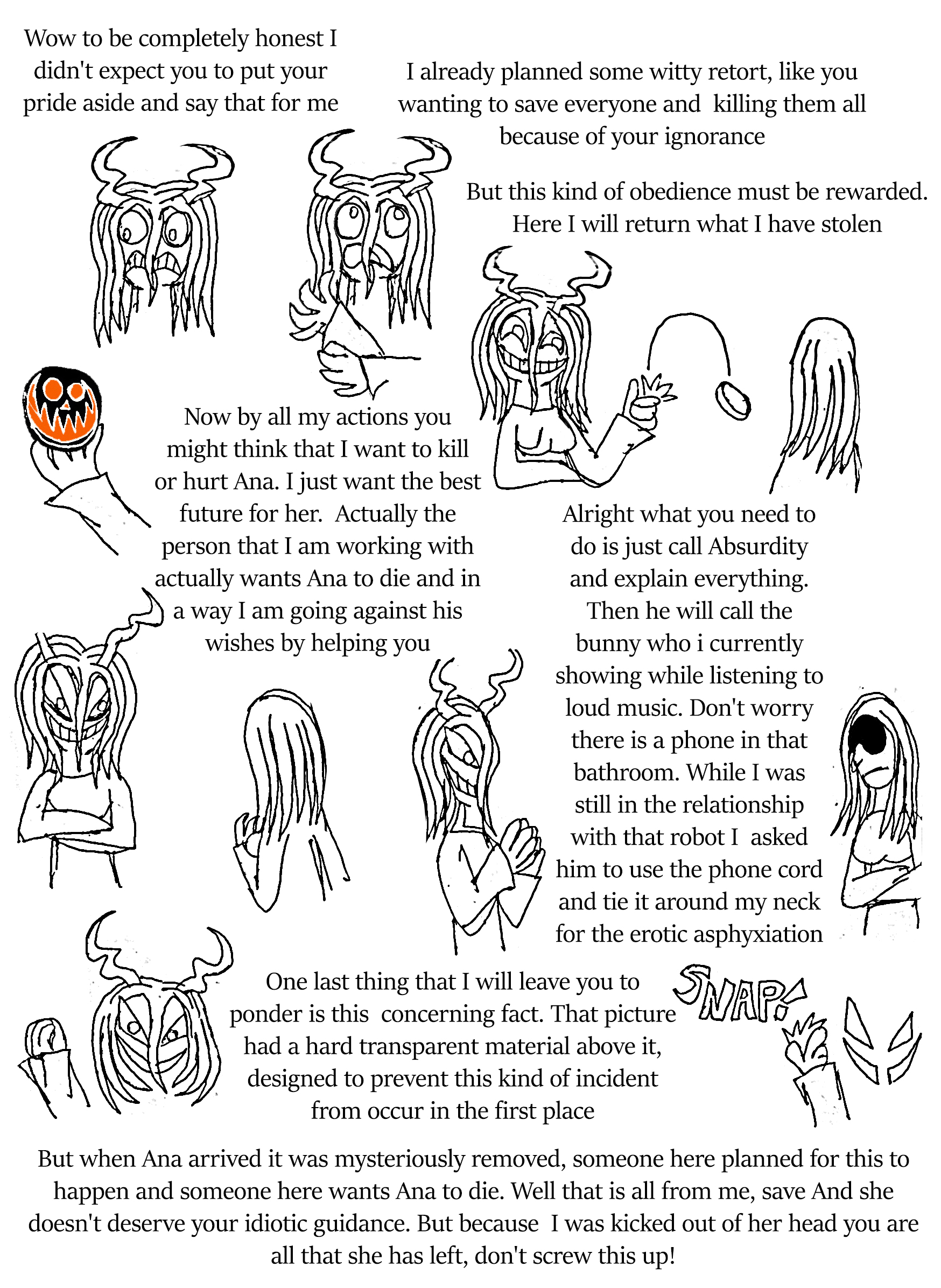 We met up with the FBI Laura, and we told her about the general that did everything he could to keep the army from fighting against the cult, she gave us the news that she activated 93's bomb. After we left, we were being stalked by someone, but before we could deal with it, Rabbot came up, and gave us a chance to save 93 if we could answer his riddle, or remove Ana's tongue if she failed. We unfortunately did fail, but Rabbot said the answer didn't matter since it was more of a test to see if Ana can respond in dire situations. I discovered I gained some of Falafaf's fortune telling powers, we discovered that 93's bomb is voice activated, and after exhausting all our possible canidates to help remove the bomb, we remembered that there was a certain riot control police officer in another dimension that may currently save her, and luckily enough, he knows about dissembling bombs. We are speaking to him through a weird receiver he got from a person who kidnapped him that was able to communicate with us, and this is where we are now. We are defusing a bomb with his help in some kind of dimensional hopping telephone.