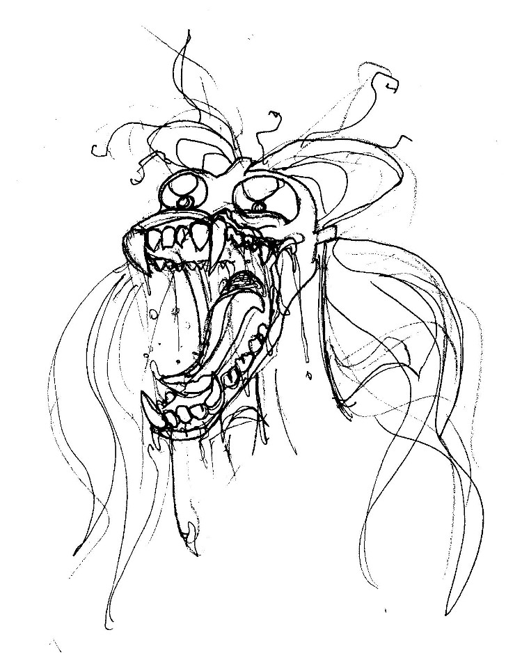 The rubber of the mask bends to your will, deforming it like snarling flesh. You sense you have teeth! Living teeth, a huge tongue, and copious amounts of saliva. The best noise you can produce is a wet, slurping bubbling hiss. As soon as you shut your disgusting maw, all evidence of it vanishes as the mask returns to normal. You no longer feel your teeth, and it is as if you have no mouth at all.