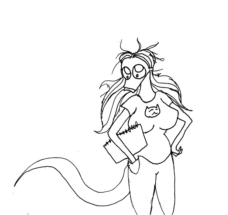 You feel like you'd better leave before his friend arrives. You find a giant t-shirt to fit over your nightmarishly large chest, and the only pair of pants that will fit you are some questionable grey sweats (they have a drawstring you can tighten around your cartoonishly thin waist). Oh, right the sketchbook! You hastily tear out the mediocre drawings and leave them in a pile on the bed, stuffing your pockets full of markers as well. You slip on the nerd's sneakers and you slip out the door.