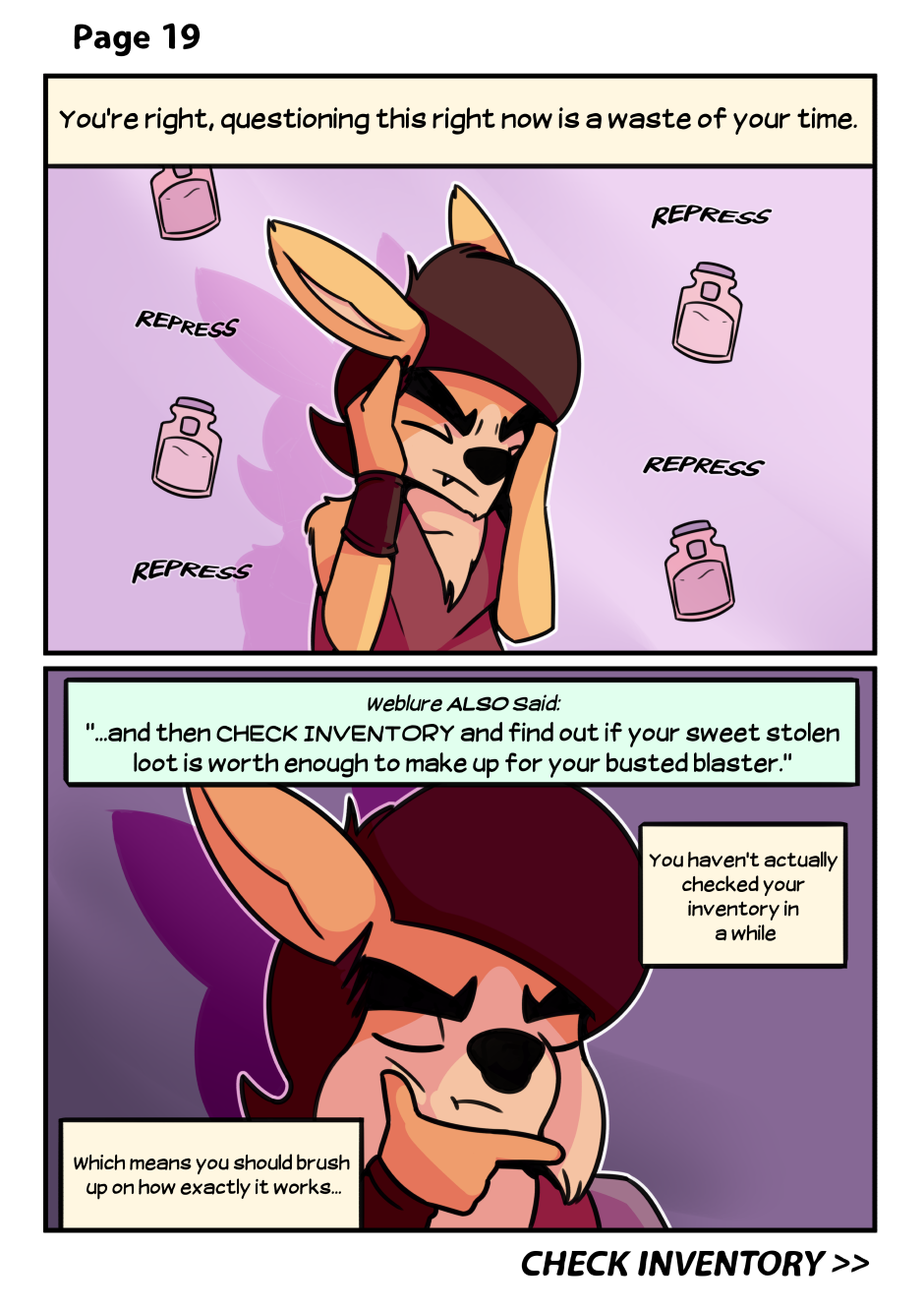 I think I'll focus on rounding out this chapter in the next ~2 or so pages, since this has kind of been a bit of a trainwreck imho. I want the next chapter to be a better starting point for new readers, and I want it to have more available interactions off the bat. (Dunno what I was thinking by starting this thing off in a dumpy warehouse with nothing to do lmao)