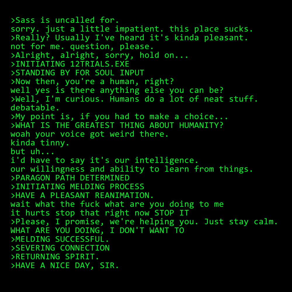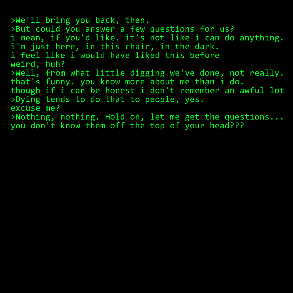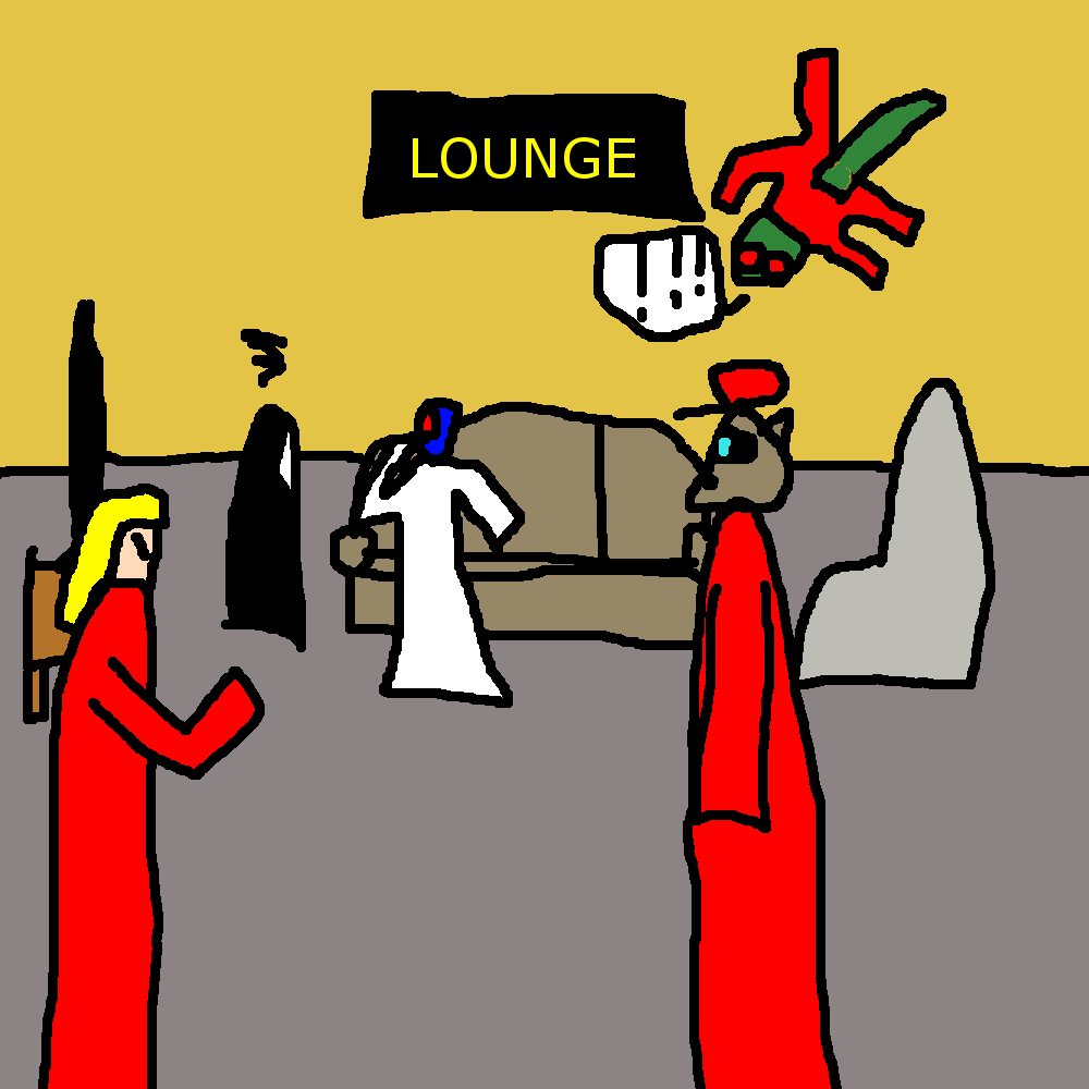 "-EET! You're awake! How joyous! We'd sorta thought you'd be asleep forever, honestly, but here you are! Up and about and covering your weird, squishy body like we even remotely care."