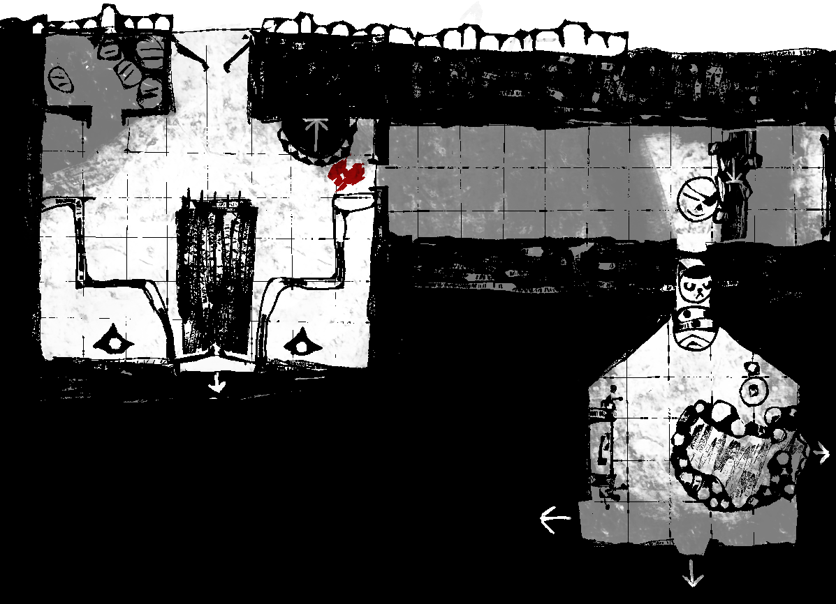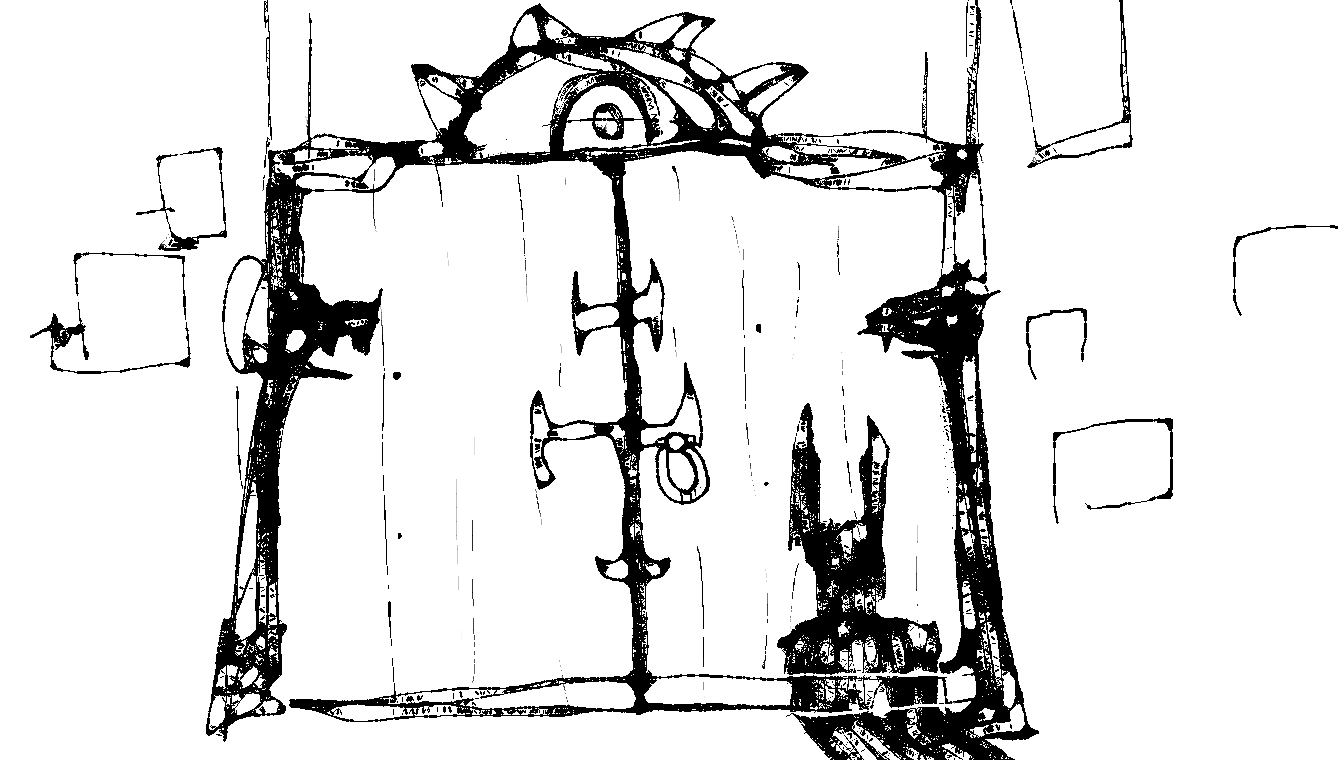 >Two pillars along the jambs, ending in two dragon faces, at head hight. Above the door: the sun with an eye in its center. The sign of the Enchantress.