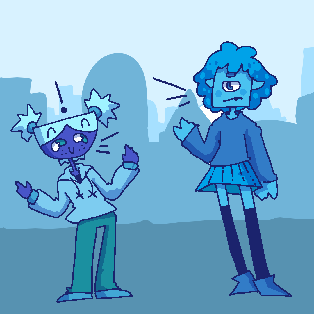 FEAR NOT, I AM MERELY A BEING FROM ANOTHER PLANE OF REALITY POPULATED BY THE BLUE SPECTRUM, I MEAN YOU NO HARM AND WISH TO PARTAKE IN FROZEN CONFECTIONS, MY GOOD CHUM!