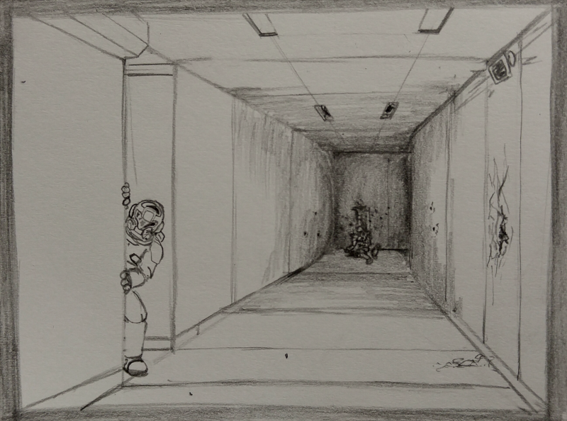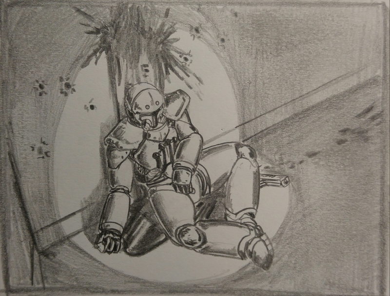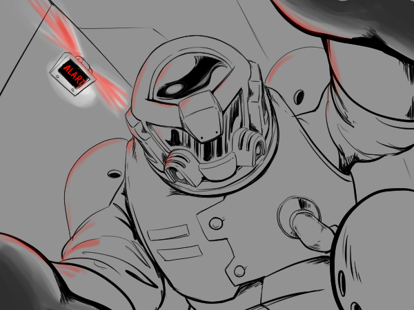 "And hey, I get the feeling those Gelzune would be pretty reluctant to fire at something with not one, but TWO experimental reactor cores of unknown power. Sounds like a plan. Now I've got some good news and bad news. The Good news is, I think I found an elevator that will take us down to the hangars. The bad news... They have a D.O.G.G.O..."