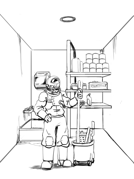 The Pilot quickly dumps as many bottles of random cleaning agents as they can into the mop bucket.