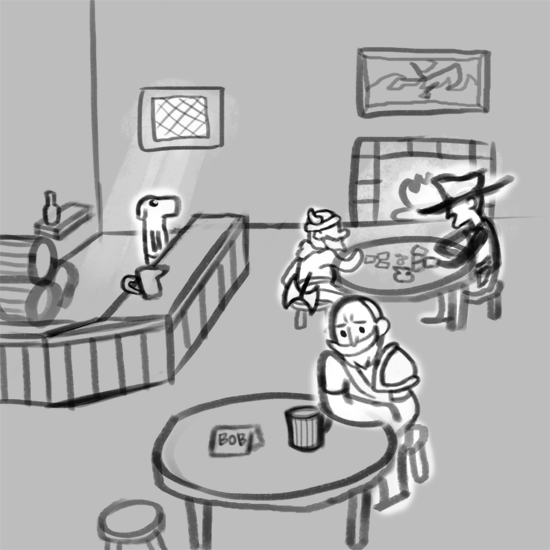 You enter a tavern. There are not a lot of folk: a kobold, looks like the tavern keeper, a dwarf, sitting alone at a table in a nameplate, two humans, playing cards, and a few other folk, that don't really catch your eye, because they are sitting alone in corners of the tavern, and they don't have nameplates. As you walk in, a smell of alcohol, danger and filth kicks you in the nose. You smell a new chapter of your life. You smell adventure!