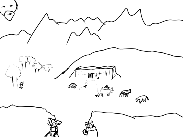 The next morning, Driblis was unable to determine gender. After that confusion, Jibblet accompanied Driblis out to the forest nearby, in the hope of combatting some elves! After some travel, they chanced upon a bear. The bear was eventually defeated without too much injury to the kobolds. After some work, the bear was skinned, butchered, and cooked. The skin has been crafted into two rawhide backpacks and a fur top for Jibblet. The kobolds camped briefly. Arriving at the forest, they spent some hours crafting a pit trap, and meeting Tomifliblin, a one-eyed cat.