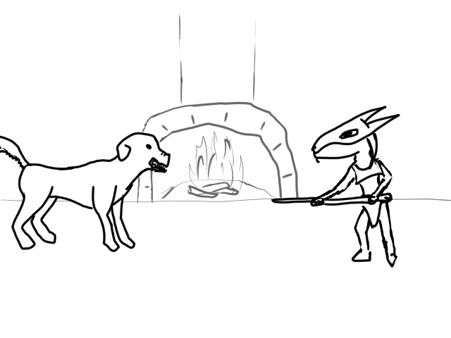 After a brief nap in the tree, Driblis wandered off for water, and met a rhesus macaque... which was not attacked. After failing some crafting work, Driblis realized an elf had wandered near the traps! The elf, unimpressed with kobold fighting skills, accepted surrender from Driblis, who also stopped Jibblet's sneak attack. The elf sent them back to their camp, and worked to dismantle traps. After some brief travel, the kobolds returned home, and Driblis slept for the remainder of the night.