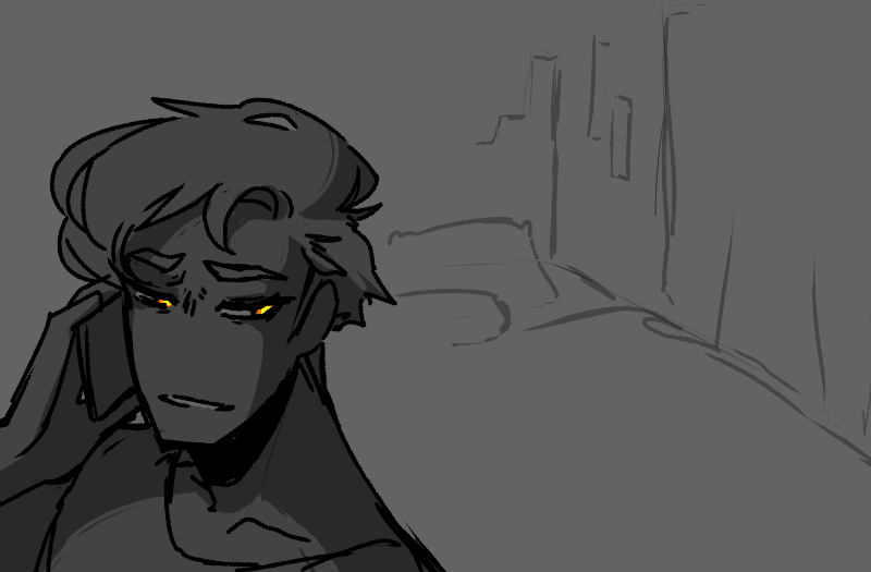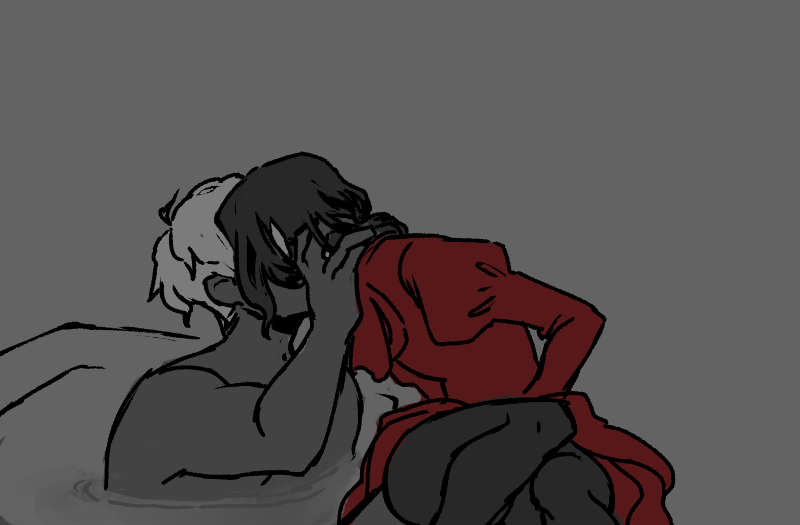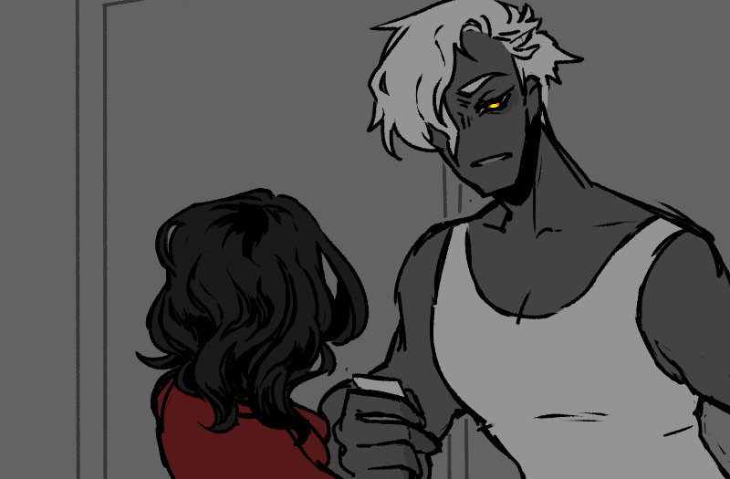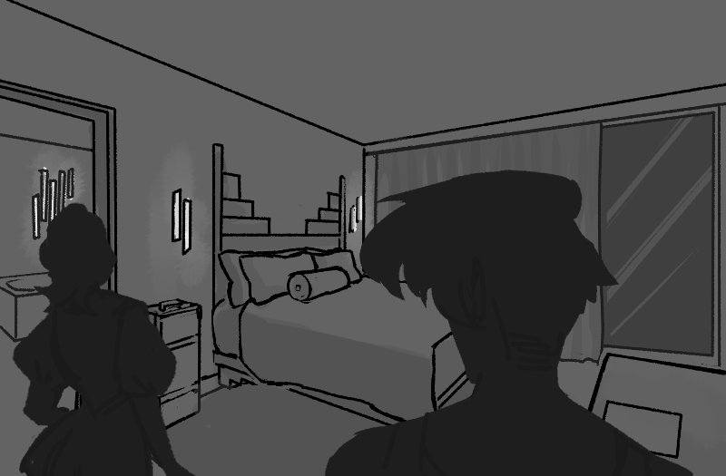 “Come on, let’s just get out. Stairs’ll be faster.” Strip grabs her hand and pulls her out into the hallway when the elevator slows to its next stop, leaving behind the grid of little glowing buttons, and they hear the guy who enters after them groan behind the closing door when he turns around and sees the carnage. That makes Strip laugh even harder, and they’re both barely paying attention as they sprint up the stairs until they finally reach the floor the shared room is on.