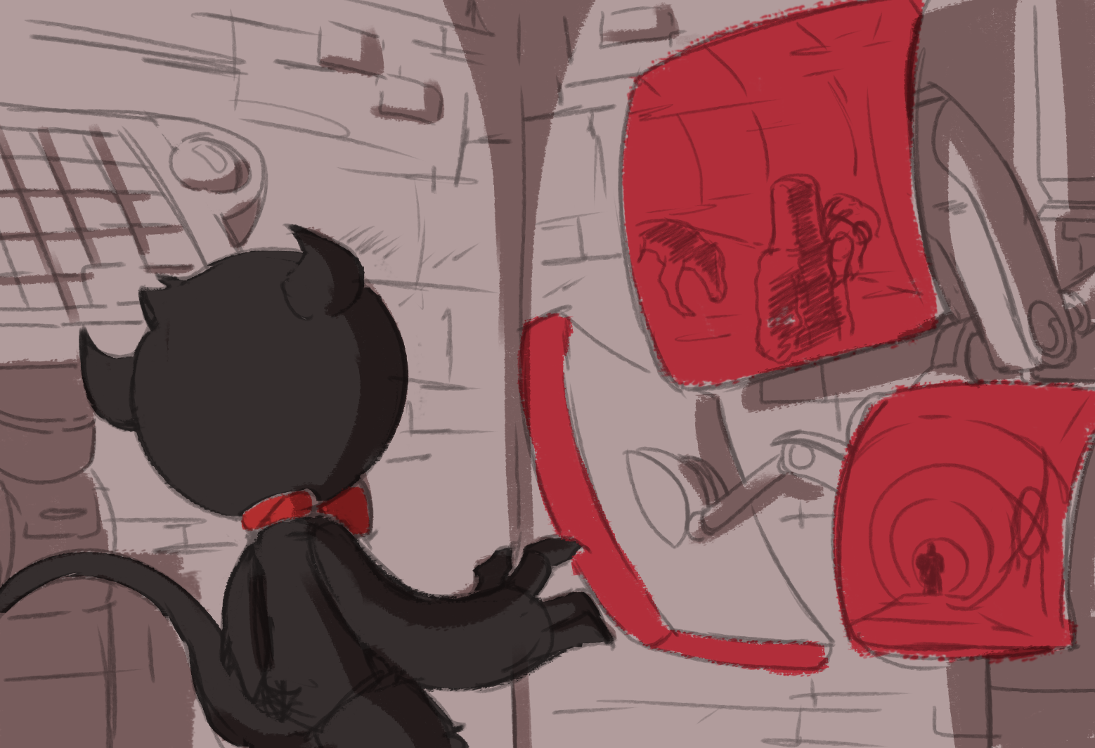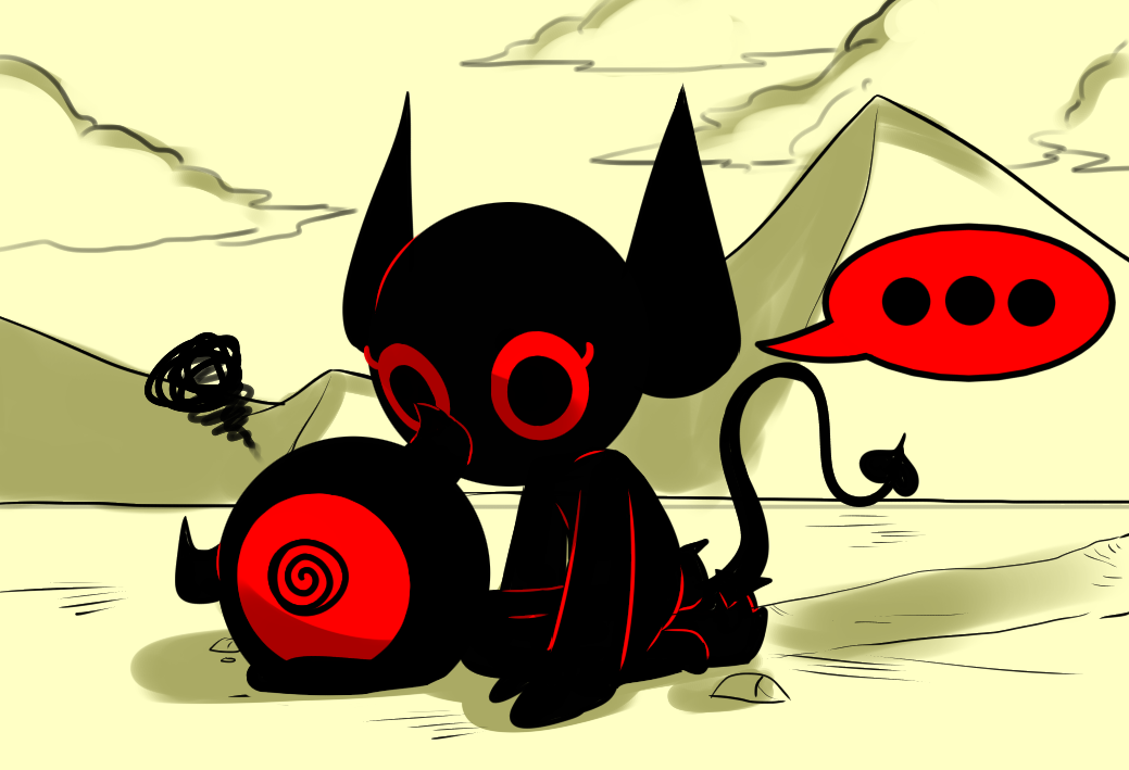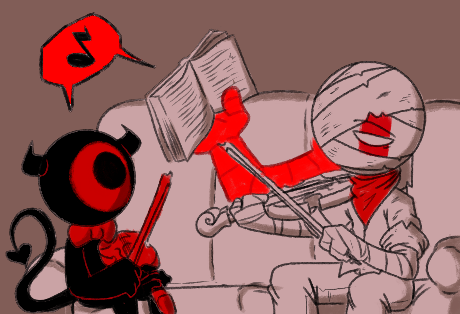 The imp's body is lined with stitches and seams, some bursting with cotton. It's eye stare's unblinking, upon closer inspection it's a painted glass eye. The imp is dressed in a tailored and patched suit that looks like it's made out of the same material as the bolts of cloth lying around the room. Delphi's stomach starts to turn.