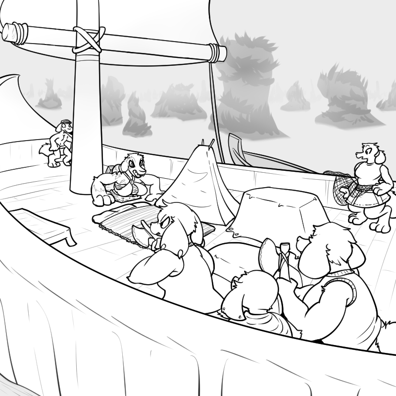 There, distant, was the pirate’s ship. In the mist beyond the stern it was only a shadow, yet, but it was broader and bulkier in hull than the traders’ ship, with a mainsail looming high and wide and two smaller stretching winglike out in front. Despite its size, it seemed to glide out from the treacherous passages of the maze that they’d just left with easy expertise. A fancy struck Zorya that, somehow, that ship was mocking how they’d fled. Its coming into view was worse. The prow was carved with the weathered visage of a snarling scaly carnivore, but the message of savage bestiality was clearer in the realities following behind the decoration. An irregular, stitched-up patching of the massive sails that first appeared to be battle damage was revealed as the leathered skins of giant creatures. Half the ribbing of the ship itself, too organically curved and smoothed, was truly built of giant ribs, and other bones, harvested from similarly massive carcasses. Even among the timber, the mismatched colors and weathering of planks suggested that most or all was sourced from wrecks and driftwood. Despite its grisly materials, however, the craftsworkship was fine. The stitches of the sails were even, the wood and bone fit neat and tight, and the riggings that arced across its heights were a complex, ordered web well beyond the workings of the ship Zorya stood upon. As she drew in the focus of her sight, she saw away to its rearward height that there was no tiller she could find. There was only a strange wheel whose attendants, though only small shapes yet and beyond the range of sensing through her soul, Zorya felt were laying eyes upon her. Other strange protrusions of wood and metal dotted the ship where ropes converged, to no immediately sensible purpose, though some resembled massive bows with odd assemblages attached. There was a suggestion, too, of shapes moving on the quarterdeck that were larger and of different form than most zisura.
