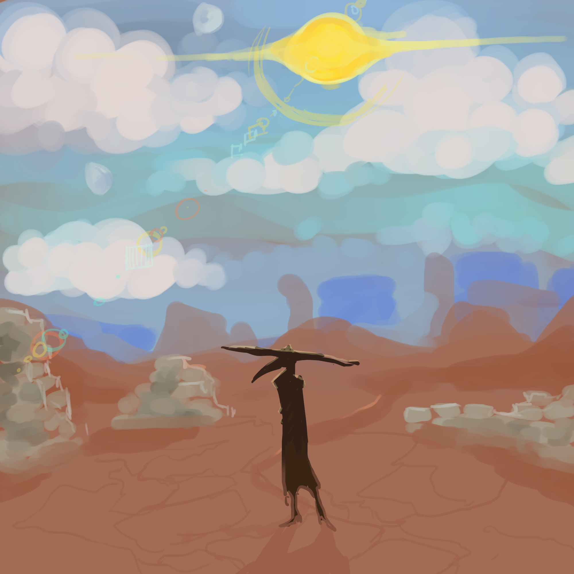 It is HOT AND DUSTY. Gravity is a little higher than average, humidity is lower. There is little wind. You are happy for your hat's brim, for while you are technically immortal, blinding light can nevertheless be annoying.