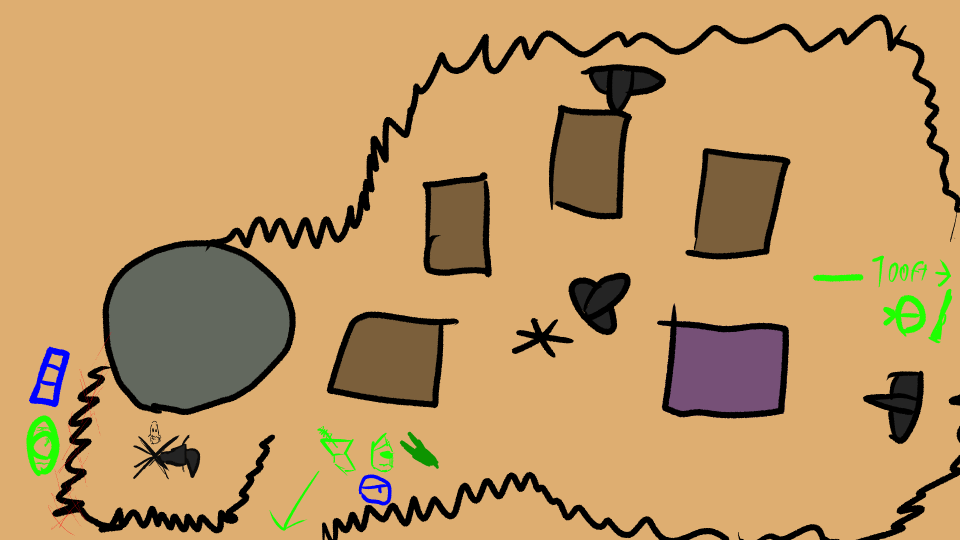 None the less, he explains the hideout is... built up, on top of ruins. The surroundings are an overgrown clearing, with no trail that leads to it, although there is a stream nearby.