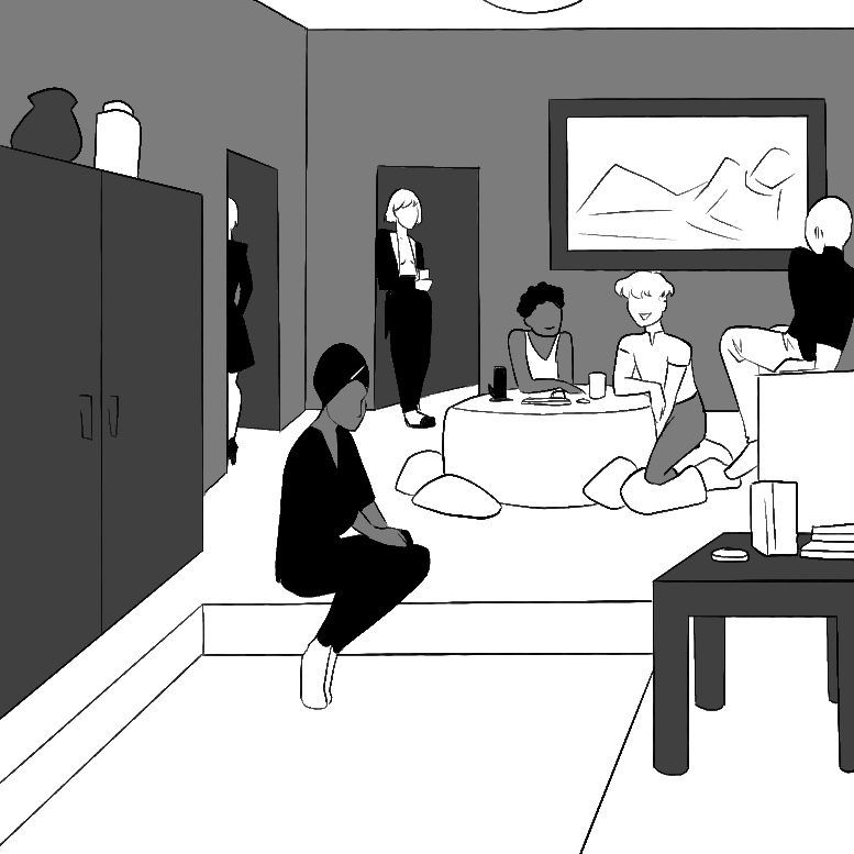 A lithe, athletically-built vampire in tight clothing led a group of six humans into the apartment, slamming the door behind them.