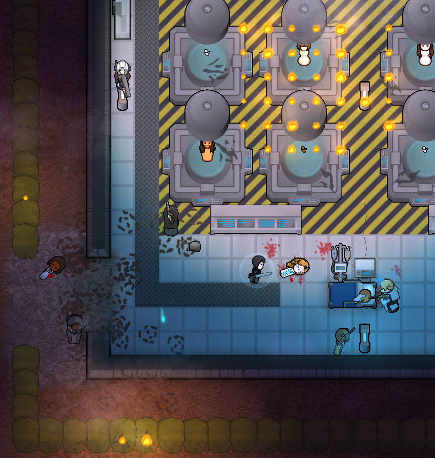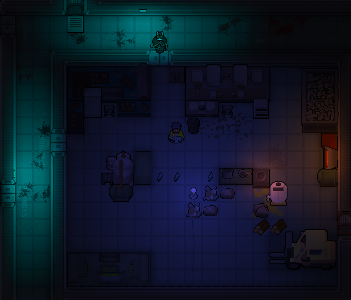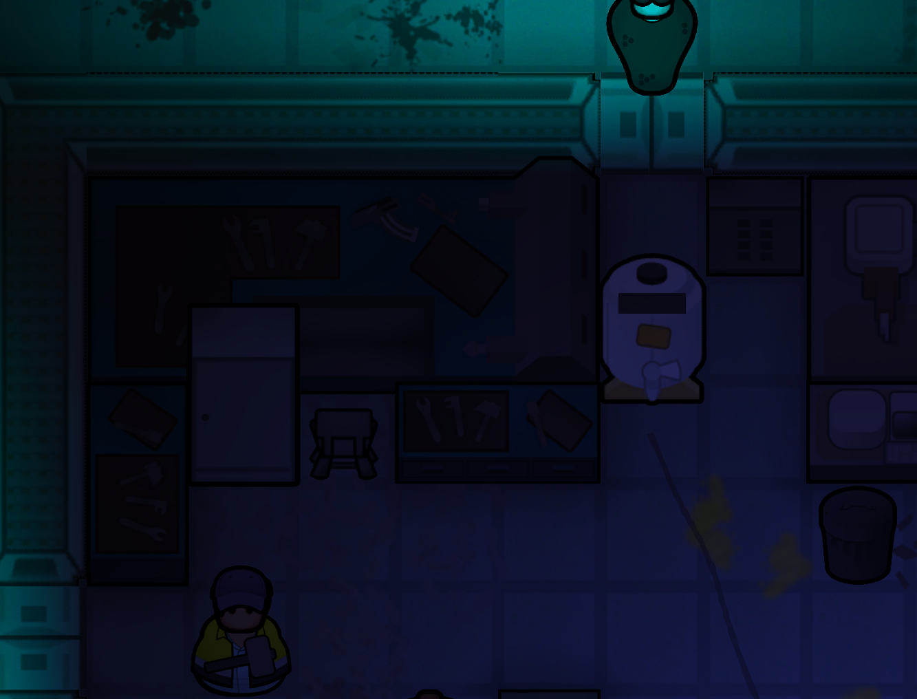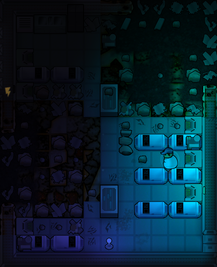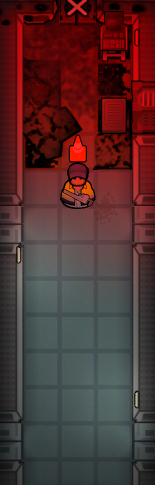 You decide your first goal should be to make sure the Merc is out of commission for good. Maybe if you hurry you can knock out two goals with one stone- but a check on your belt informs that would be quite a tight squeeze. You have a little bit more than an hour of atmospheric protection left, and while you might be able to cross from the front of the ship to the rear in an hour, that counts on encountering zero hazards or anything else that’d eat your time. Which is probably unlikely. And, you would still need to get the Merc’s body to a surgeon for the installation of the Chief Engineer’s stack before he wakes, which is probably impossible.