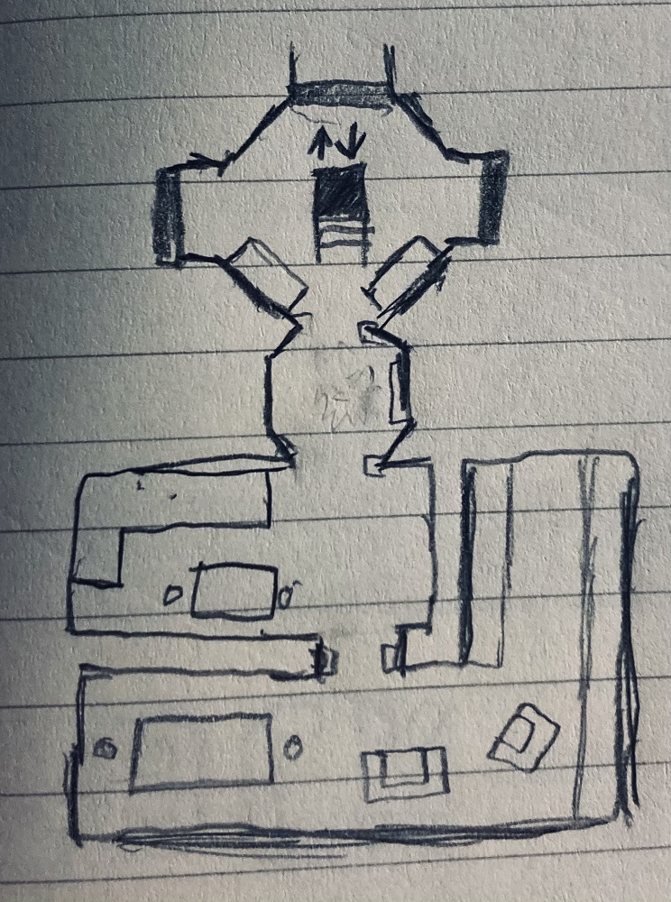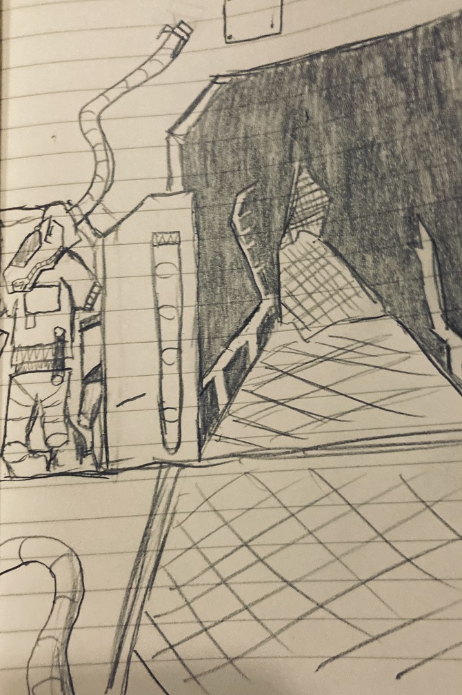 I take it and investigate the hissing in the next room, slowly peaking around the corner. My eyes are drawn to a trio of holes, punched inwards towards the room. On closer inspection, there seems to be no room on the other side of them, or... anything for that matter. Just pure blackness, with air hissing out through the gaps. Tiny metal flakes dance and glitter in the air, also being pulled through into the darkness.