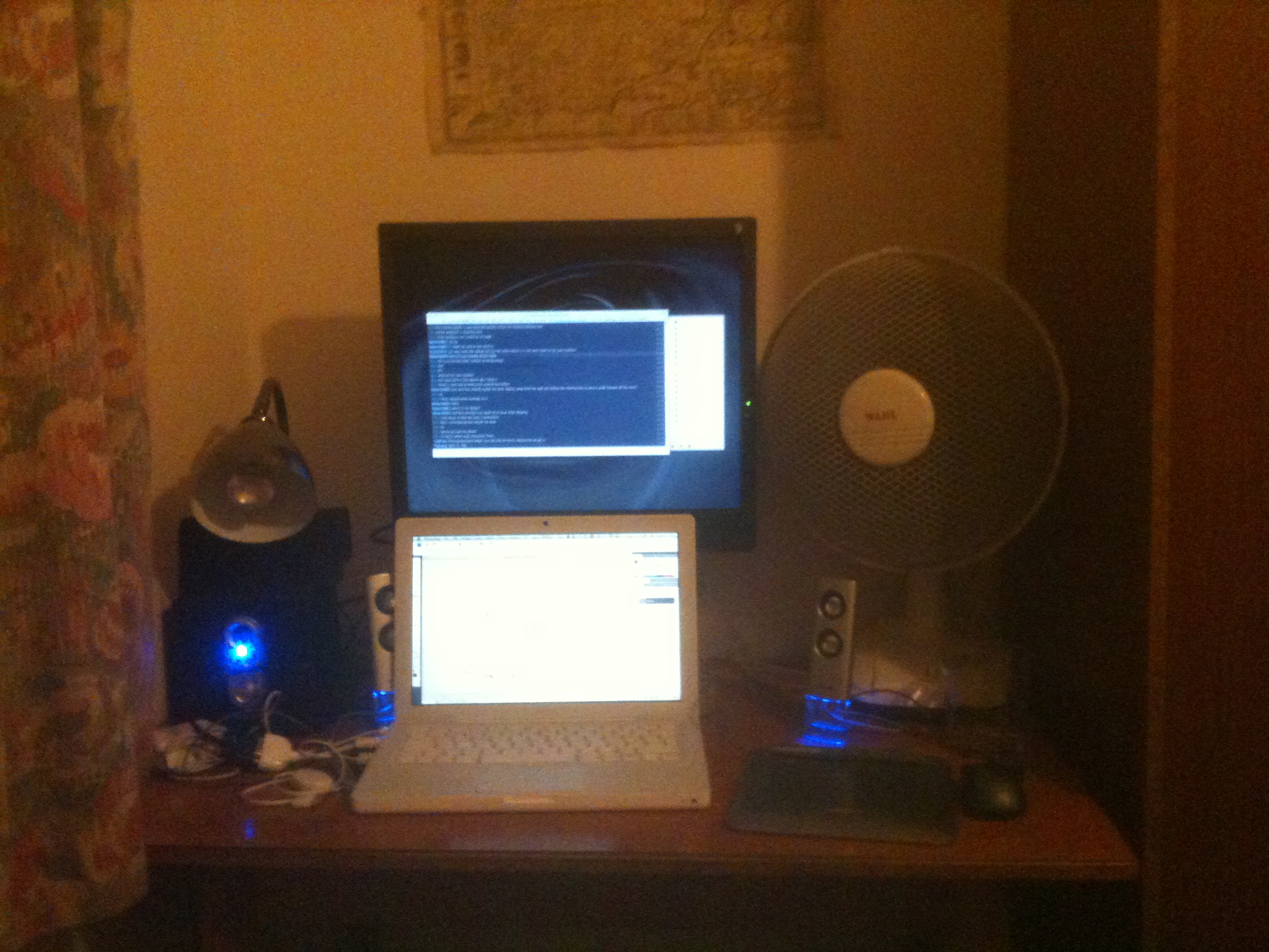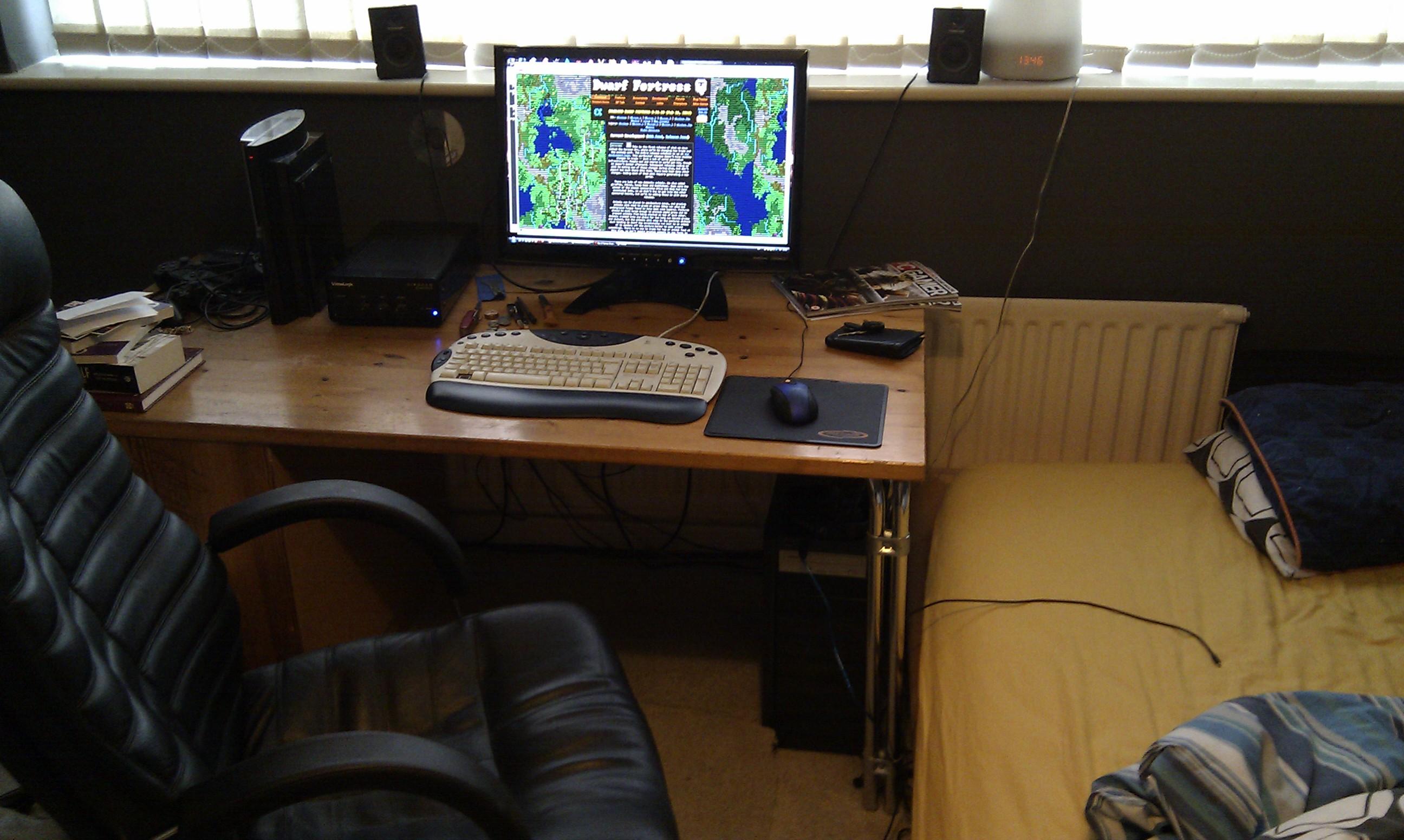 Highlights include: Nice leather chair. Radiator to warm feet on. Left side windows key removed from keyboard years ago because I'd press it in the heat of battle and accidentally break games. Bed next to desk so I can lie in said bed and use the PC if I turn the monitor around. Lots of space.