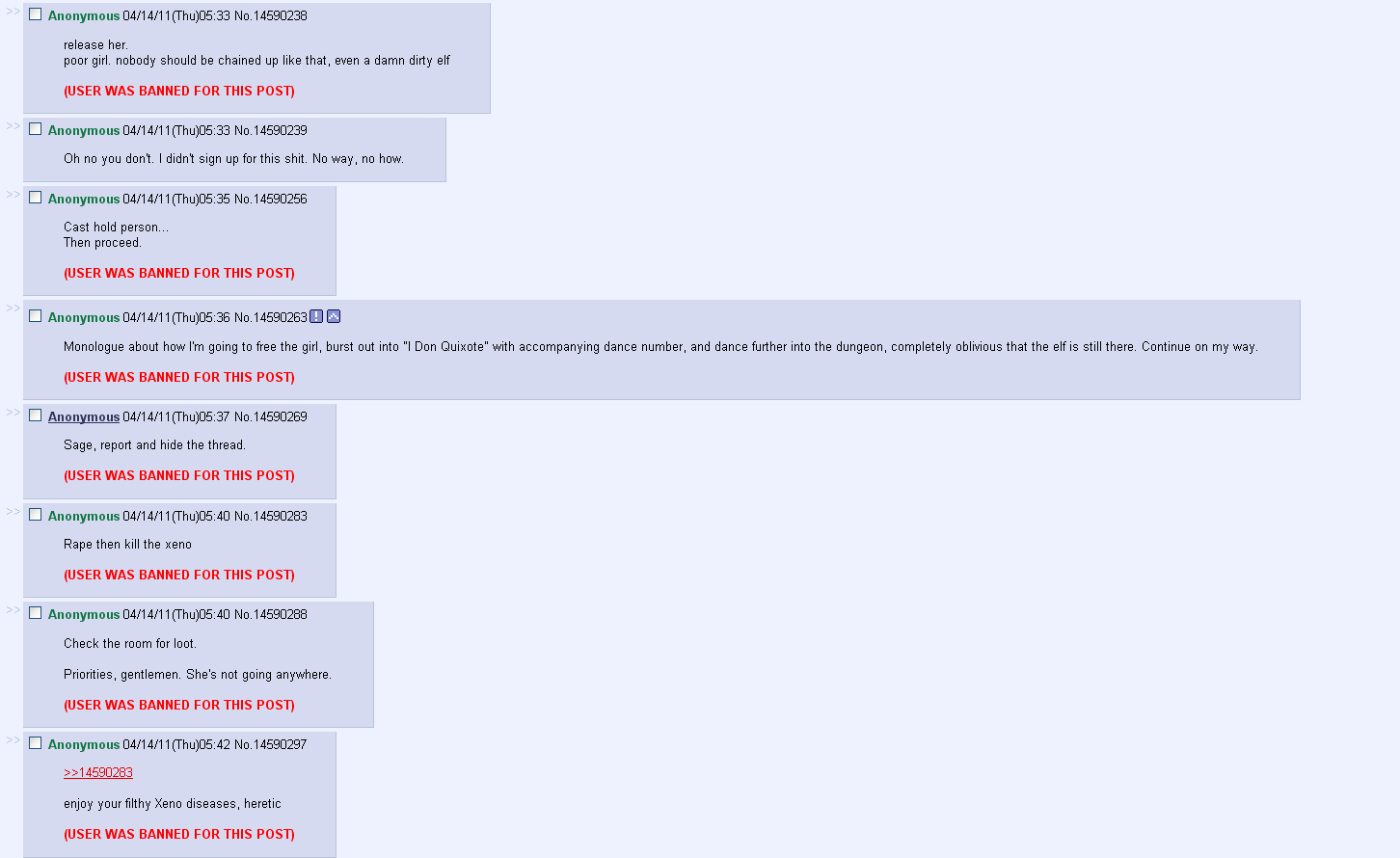 You're allowed a little of these two videogames, but god forbid there is more than one thread of each. And man, you better not start that Planescape, Neverwinter Nights, or Baldur's Gate shit here! Good lord, we hope you NEVER talk about vidya settings (such as Demon's Souls) in a traditional game, because it's VIDYA and NOT A TRADITIONAL GAME.