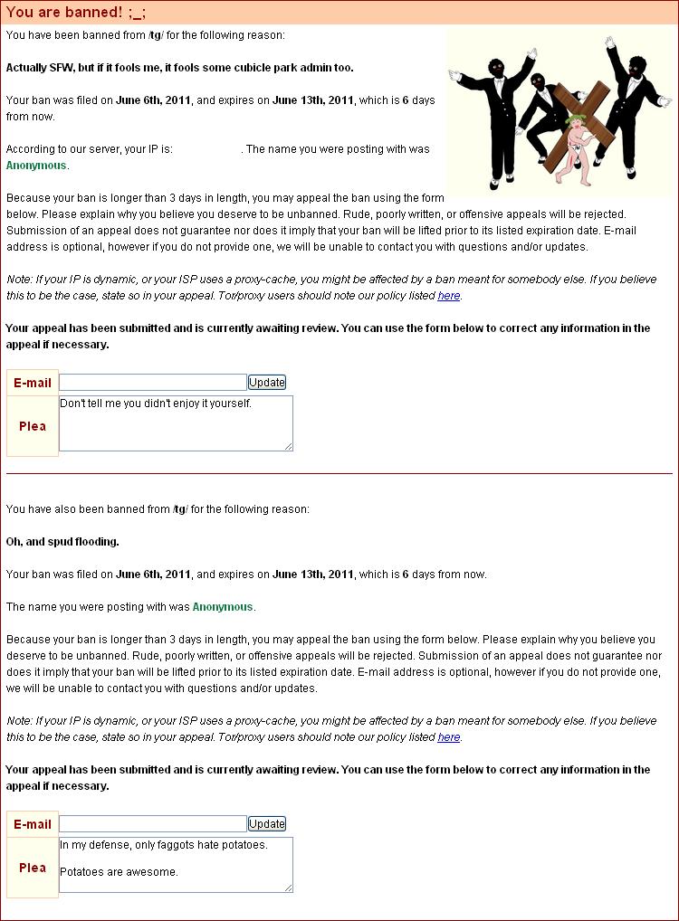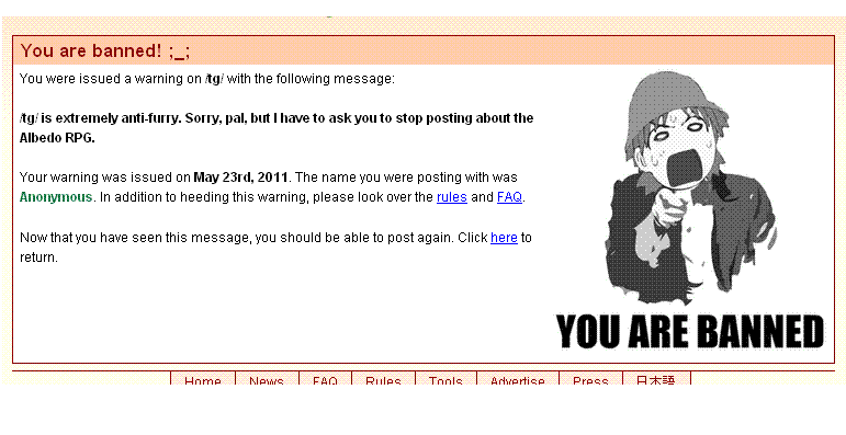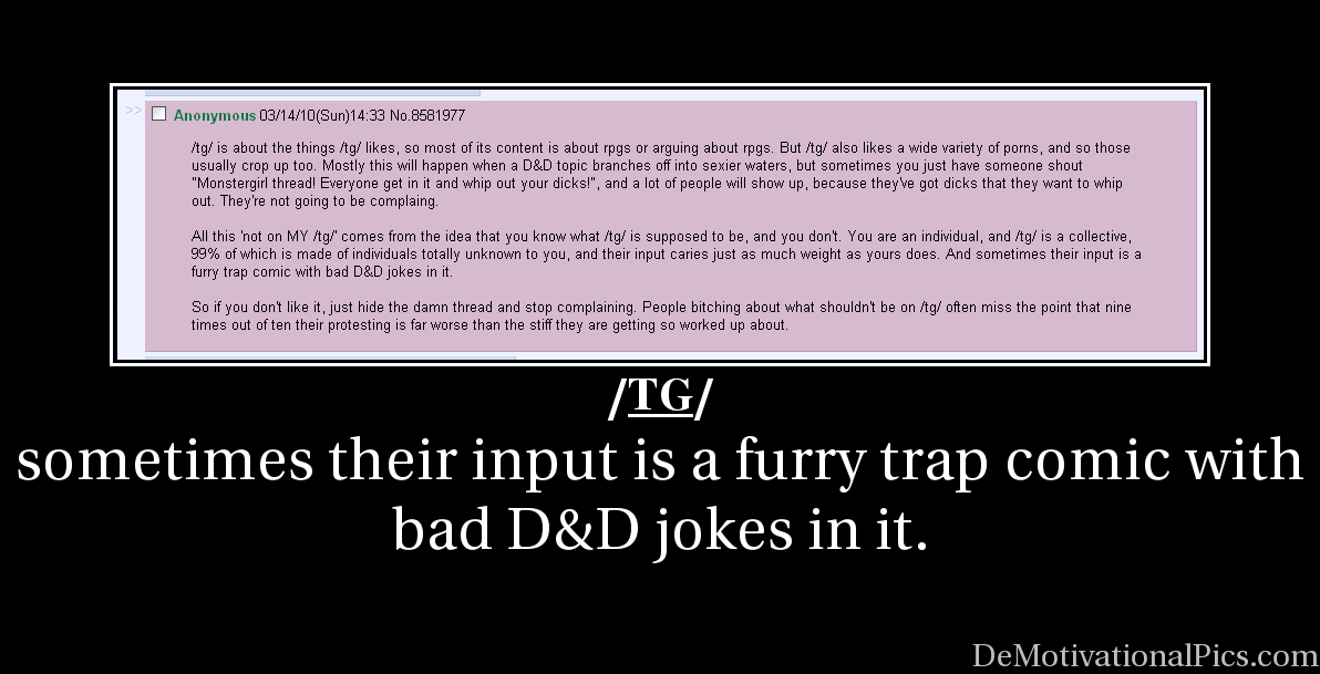 Meta for 4chan /tg/ was moved here because it's now a delete-on-site offense, which makes it awful hard to talk about. Here, there is no such rule.