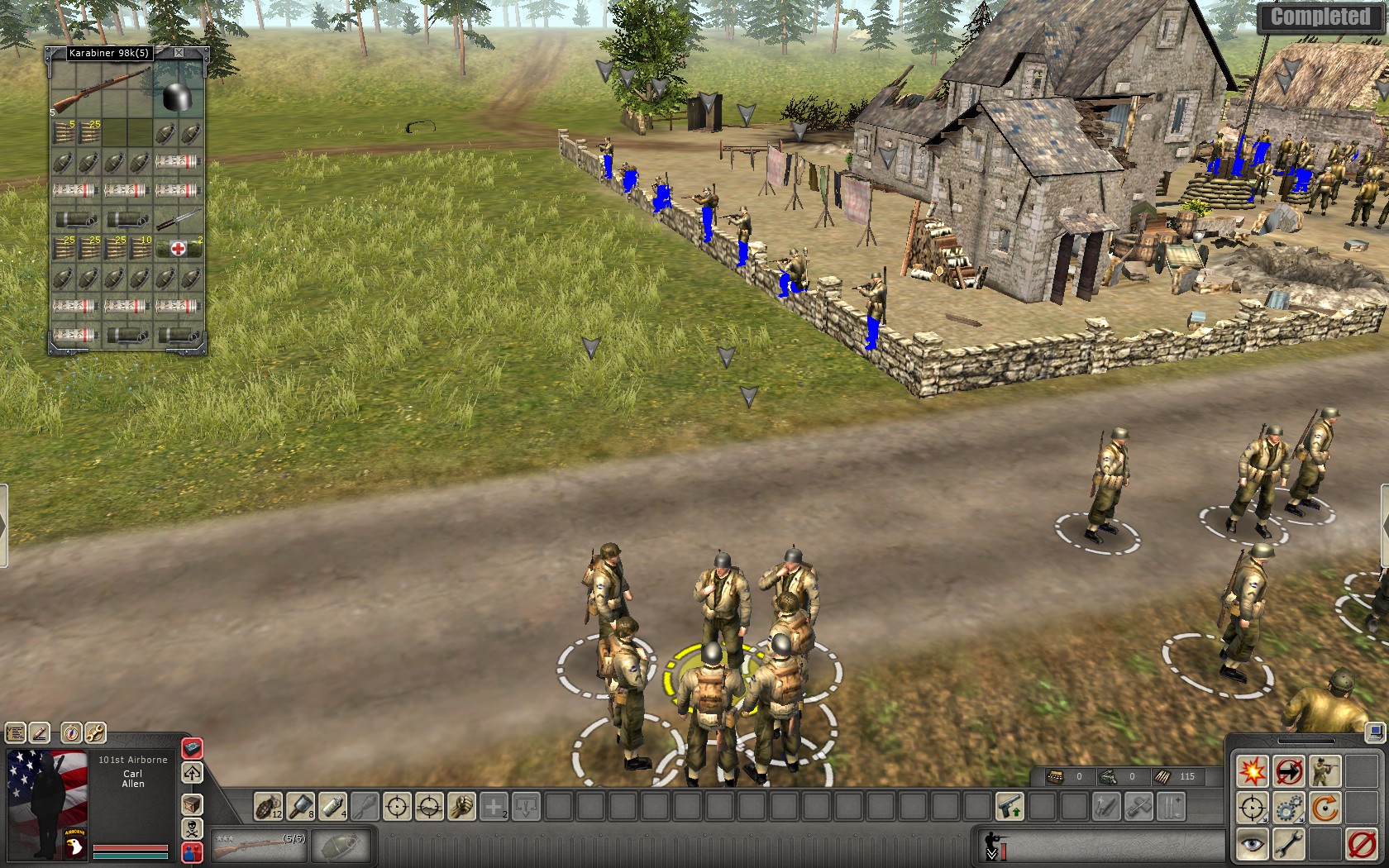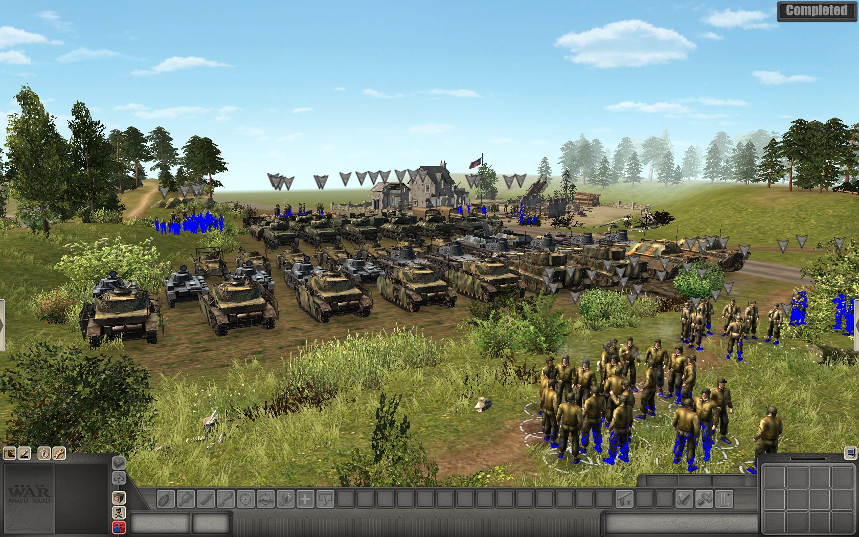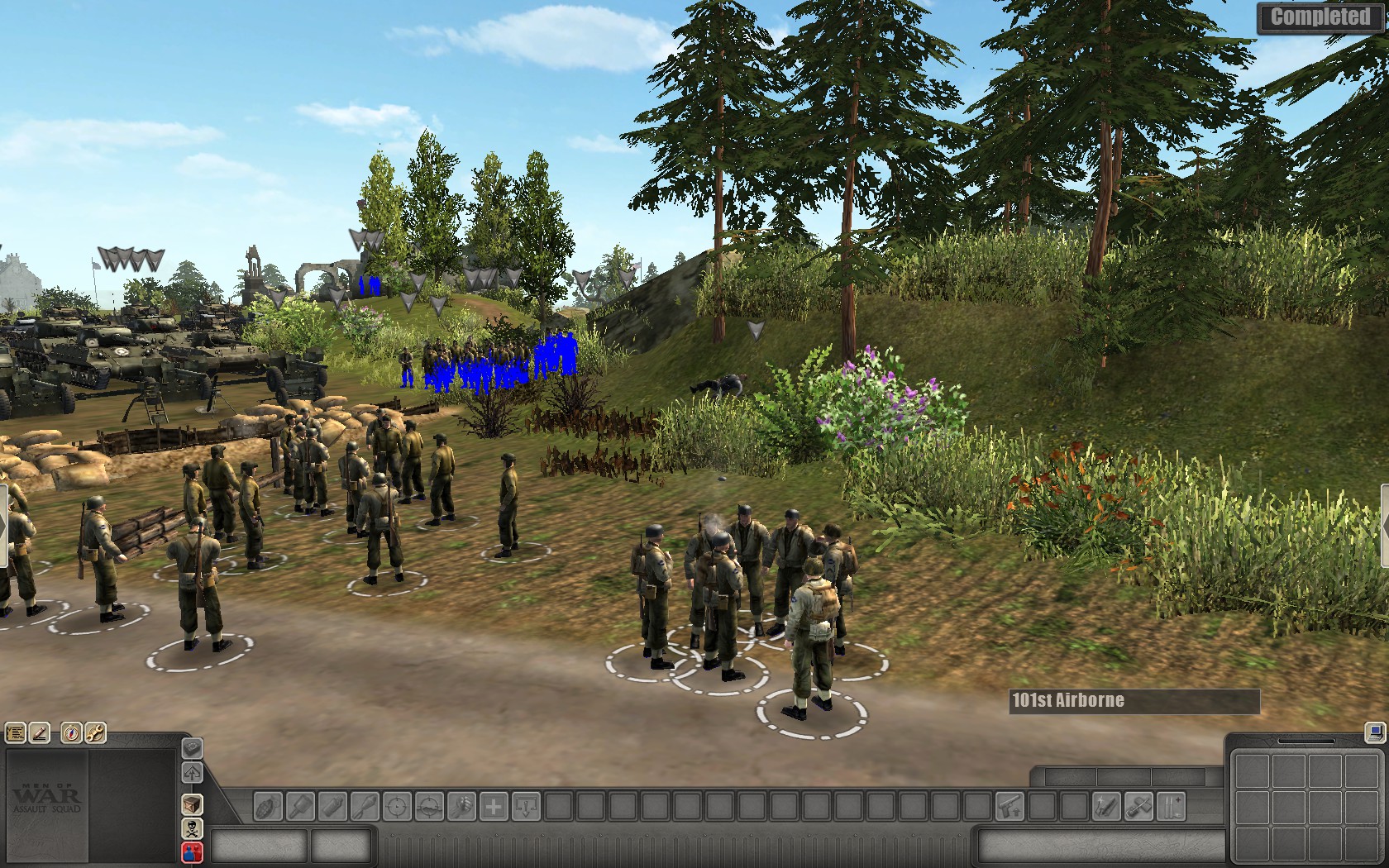 The initial force consisted of one M8 howitzer, an M5A1 Stuart light tank, an M3 light antitank gun, an M1 mortar and an infantry element roughly the size of a platoon, including a flamethrower and a sniper. With generous use of HE fire from the M8 and Stuart, the beachhead was secured. Immediate enemy counterattacks in the form of infantry and light vehicles were soundly beaten, with captured machineguns and an antitank rifle put to immediate use.