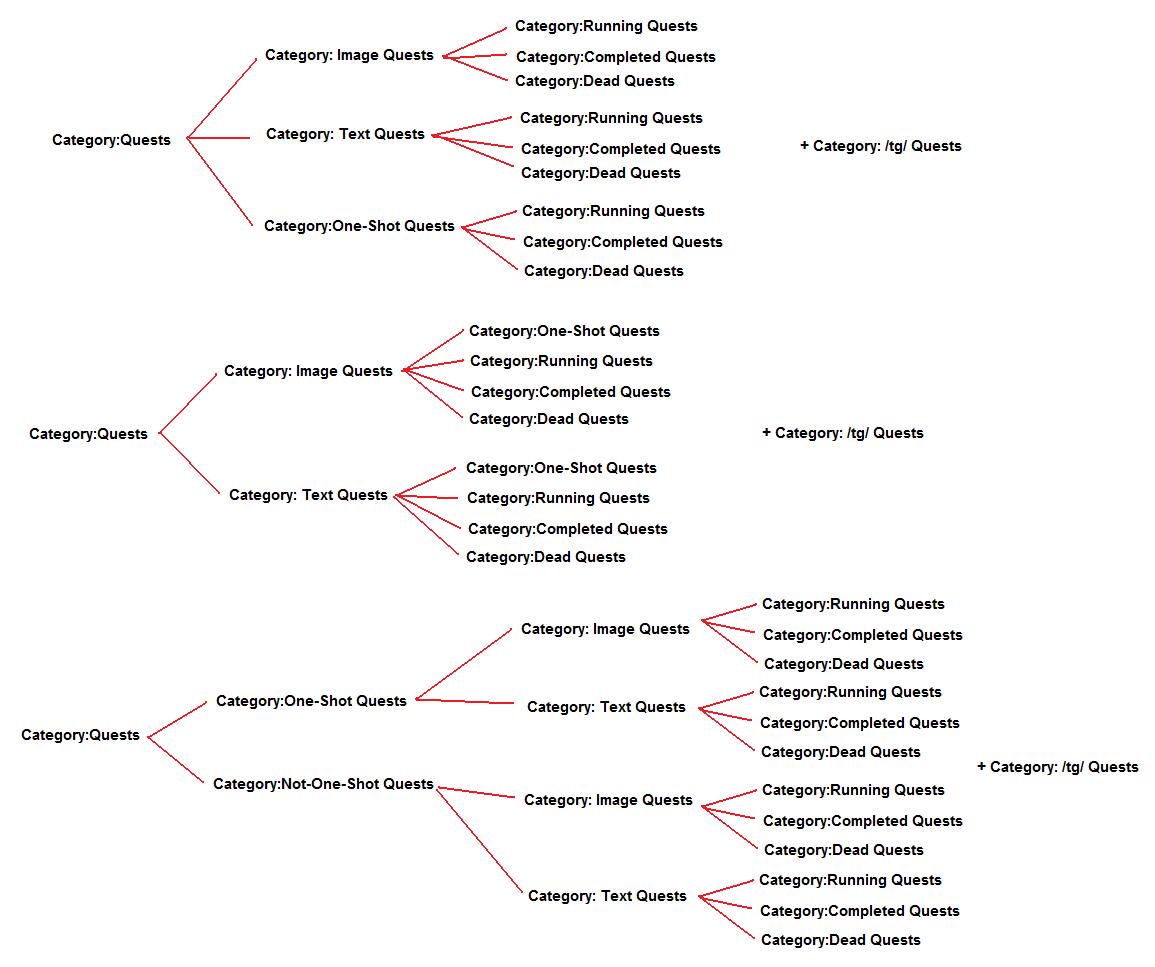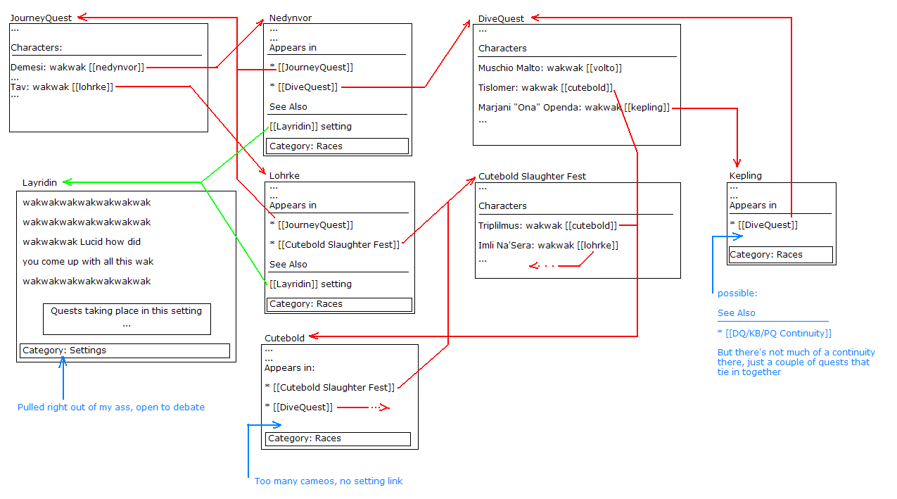 This proposal unfortunately presents problems for crossover settings or settings that borrow from other quests - Cutebold Slaughter Fest is a prime example. I just gave Lohrke as an example of a Layridin race, but they also exist in CSF alongside Sergals, who would be listed under the Vilous setting, and Cutebolds, whose origins lie in the depths of /tg/. We would either have to accept the possibility of repeat entries in the template (and the possibility of rapid template inflation) or accept that we have to leave some quests hanging.